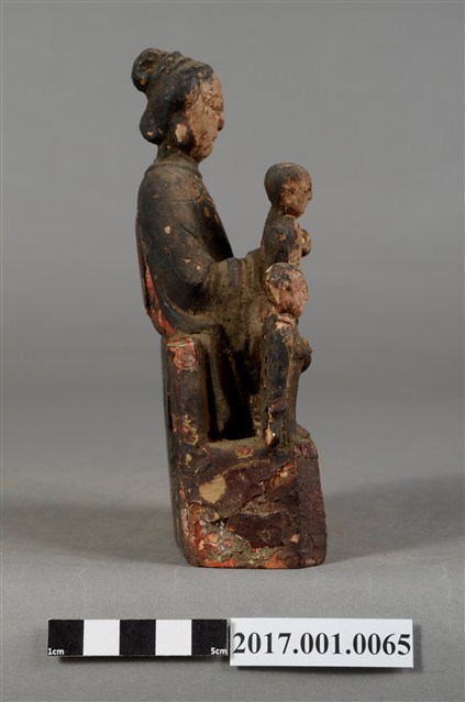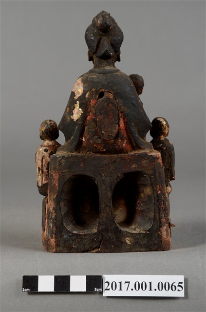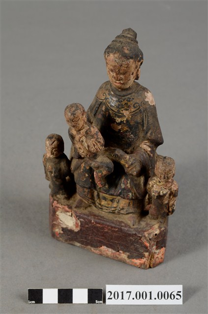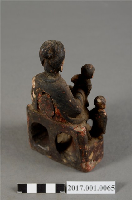 1.本件木雕婆姐像,作坐姿姿態,坐於凳子上,背面開有橢圓形入神洞,封榫尚存,表面施作塗裝粧佛技法。髮梳髻盤於腦後,顏面表現雙眼垂視,緊抿著嘴,身著盤領衣,雙腳套弓鞋。雙足垂下端坐,抱著一位幼童,左手握著幼童左腳、右手扶著幼童腹部。婆姐懷中所抱的幼童,前額留髮,上半身著右衽窄袖衣、下半身著長褲,腳套鞋,左手橫置於胸前,右手自然垂下,婆姐左右兩側也有幼童,幼童立像挺身,幼童皆前額留髮,身著窄袖長袍,左側幼童左手垂下、右手持物橫置胸前,右側幼童的姿勢相反。