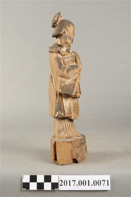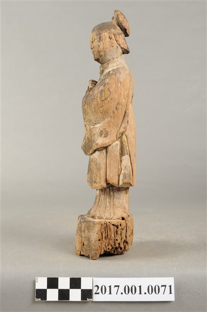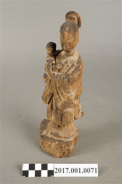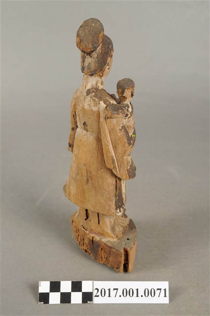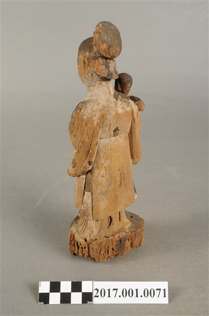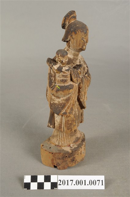 1.本件木雕婆姐像,表面粧佛已褪去,僅存些許安金。頭梳高髻,顏面雙目半睜,身著袍服為立領、寬袖,腳套弓鞋。立姿挺身站於臺座上,右手抱一幼童,左手做護衛狀。本件臺座作圓臺,無雕刻、裝飾。