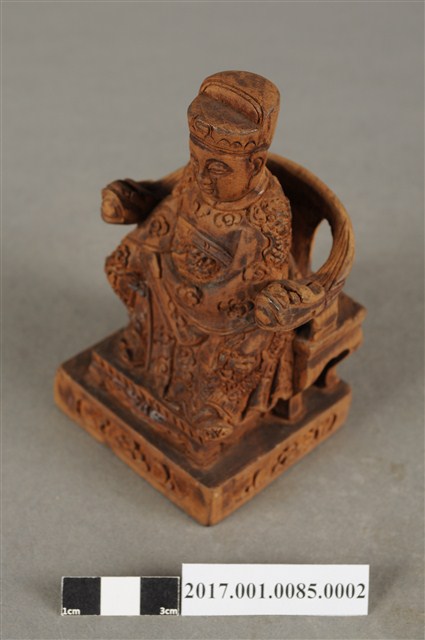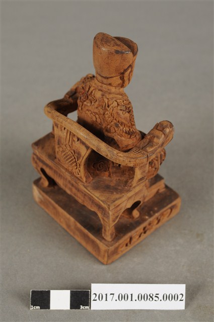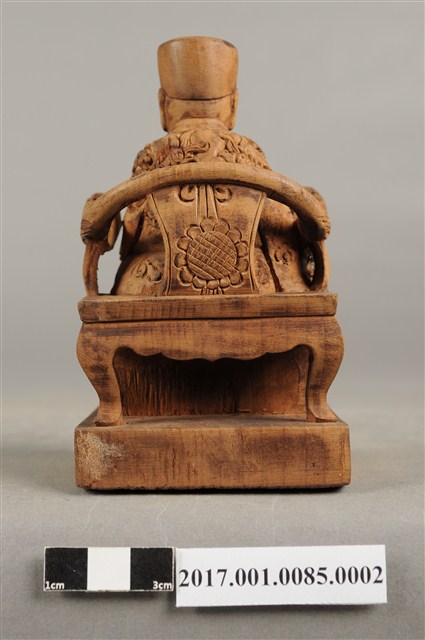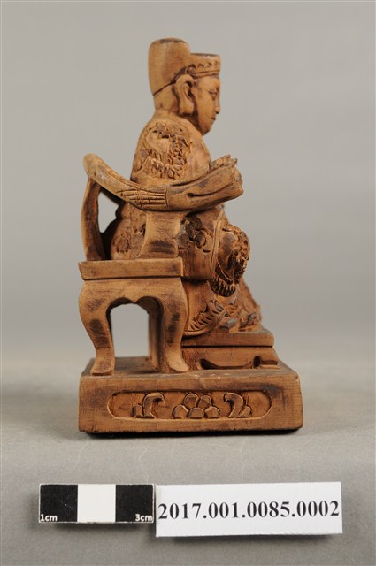 1.本件木雕王爺像採坐姿,端坐於圈背椅上,表面以錦雕工法飾成。王爺作年輕男子相貌,無鬚,面貌斯文,雙眼半睜,面帶笑意。頭戴幞頭,身穿圈領寬袖長袍,袍服雕飾蟒紋、雲朵、花卉等紋,胸前有看帶,腳穿皂靴。左手伸至右腰處,右手與左手互握,露出食指,作抱袖體姿態。左腳向外略伸出,右腳內縮,作文武腳姿態,座前置踏几,圈背椅背部飾以菊花紋,臺座作方矮臺,臺座雕飾花卉紋。