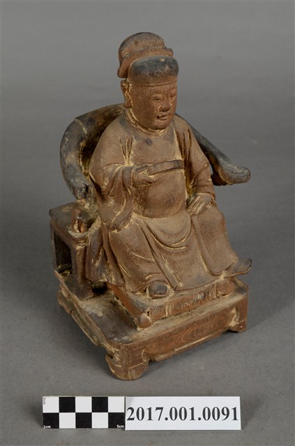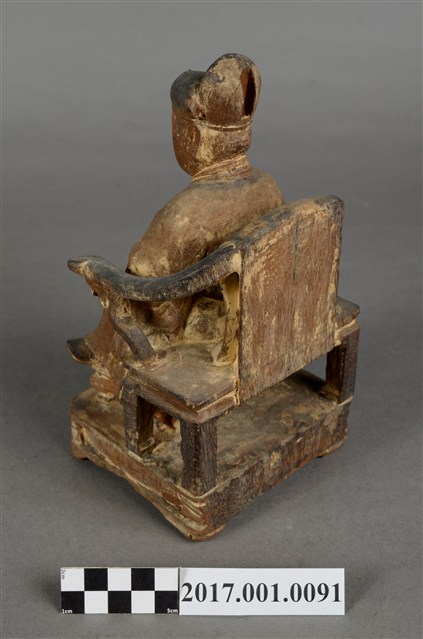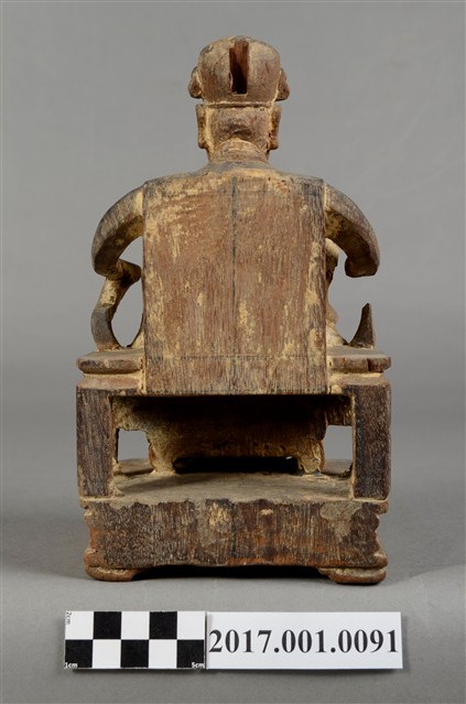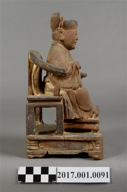 1.本件木雕王爺像,作坐姿姿態,表面粧佛已除去。臉型輪廓橢圓,雙眼半睜。頭戴幞頭,幞頭後有凹槽,身著寬袖盤領衣,肚腹圓凸,胸前束看帶,腳穿皂靴,坐於圈背椅上。挺身端坐,雙足垂下,左腳向斜前方外推、右腳向內,作「文武腳」坐姿,左手掌向下置於腿上,右手小臂上舉握看帶。圈背椅的椅背披著坐布,圈背椅右側扶手的出頭損毀,椅前有踏几。椅下的臺座作方臺,座前下方雕刻成可供書寫神名的橫堵。