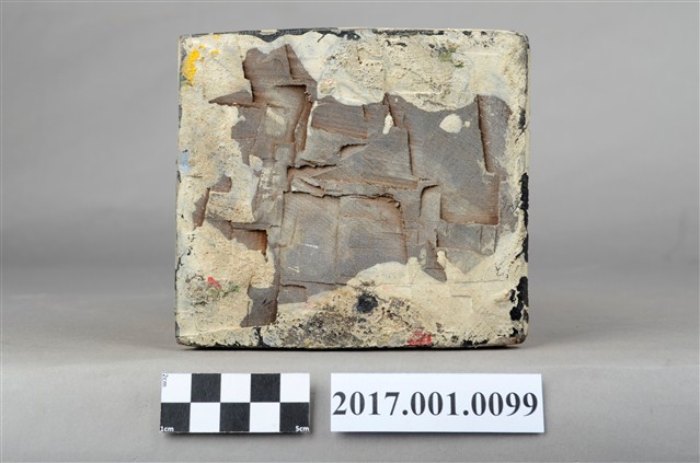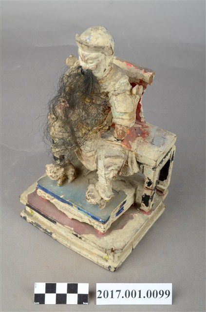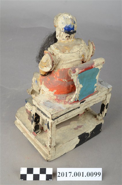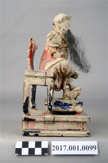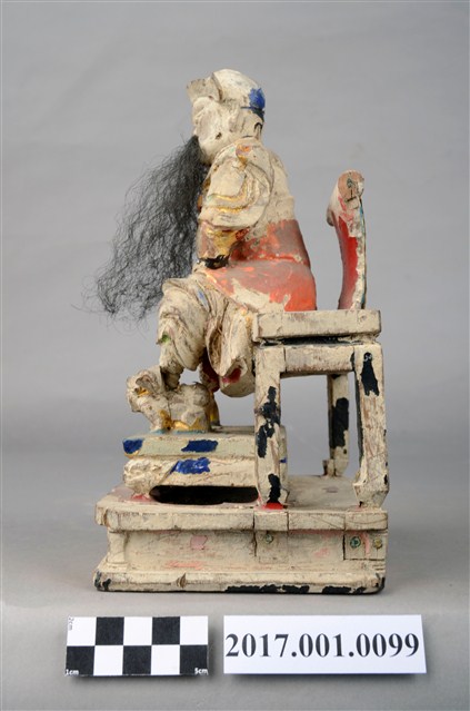 1.本件木雕王爺像採坐姿,端坐藍色圈背椅,粧佛大部分除去,破損以補土填補。王爺臉部色彩除去,皺眉,雙目瞠視,顴骨凸起,蓄有長鬚,神態威嚴。頭戴兜鏊,身穿甲袍,腰束玉帶,腳穿皂靴,左手手掌朝內扶於左膝上,右手握拳置於右腿上,持物遺失。右腿翹起,左腳踩獸座。圈背椅前置踏几,飾以獸座,圈背椅兩側扶手斷裂。臺座作束腰矮方臺,飾以花草紋裝飾。