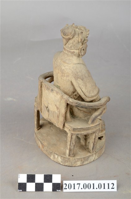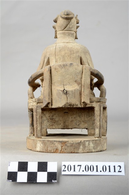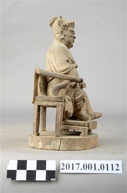 1.本件木雕王爺像採坐姿,端坐圈背椅上,粧佛已除去。王爺作中年男子相貌,嘴部、臉頰有植鬚孔,皺眉,雙眼瞠視,鼻頭與顴骨凸起。王爺頭戴兜鏊,身穿甲袍,胸前有看帶,腳穿皂靴,右腳露出鎧甲,左手持物置於左膝上,持物已削去,柄部露出圓孔,右手扶於右膝上,左腳向外伸出,右腳內縮以腳尖支地,作文武腳姿態,圈背椅前置踏几。臺座作矮圓臺。