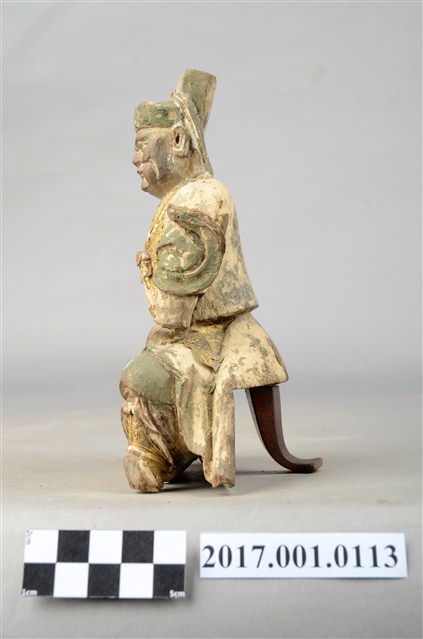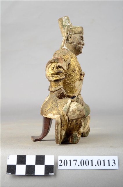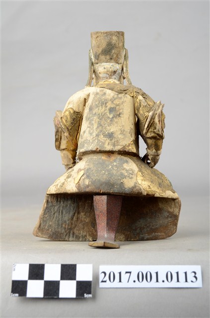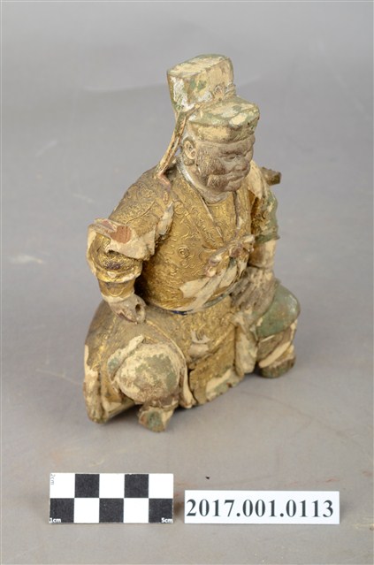 1.本件木雕王爺像採坐姿,採脫椅技法,表面施以粉雕安金彩繪飾成。王爺作中年男子相貌,臉部色彩除去,嘴部有植鬚孔,皺眉,雙眼瞠視,鼻頭顴骨凸出,表情嚴肅。王爺頭戴幞頭,身穿甲袍,外穿裲襠,甲袍粉雕盤飾花草、雲朵等紋。王爺右手持物置於右膝上,持物已削落,左手扶於左腿上,雙腳削落遺失。
