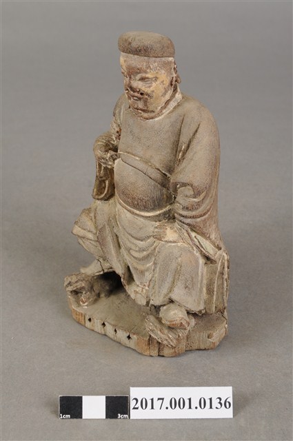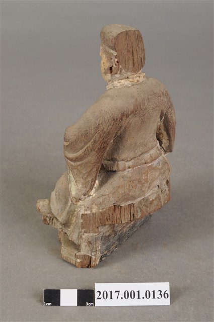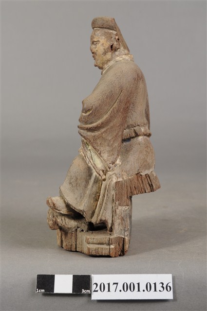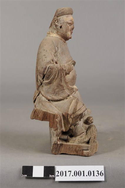 1.本件木雕王爺像採坐姿,採脫椅技法,粧佛已除去。王爺作中年男子相貌,嘴部有植鬚孔,臉頰豐腴,雙目半睜,鼻頭削落,神情嚴肅。頭戴幞頭,身穿圈領寬袖長袍,腹部束腰帶,胸前有看帶,腳穿皂靴踩獸座。左手手掌朝內扶於左膝,右手抬持看帶,左腳朝左伸出,右腳內縮,作文武腳姿態。臺座作方矮臺。王爺後腦削去,臺座前端削去。
