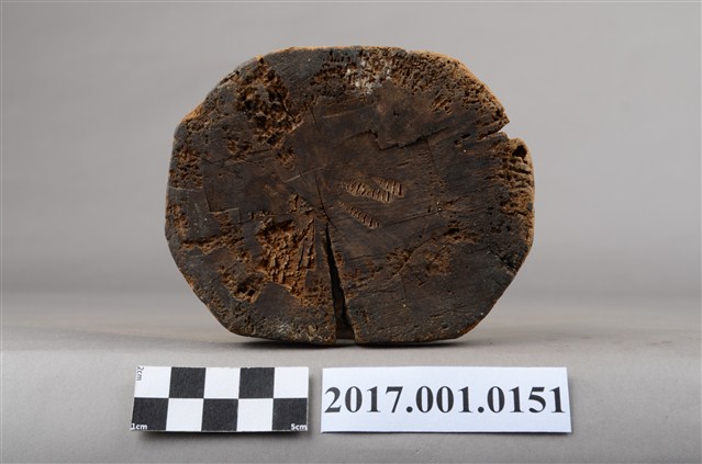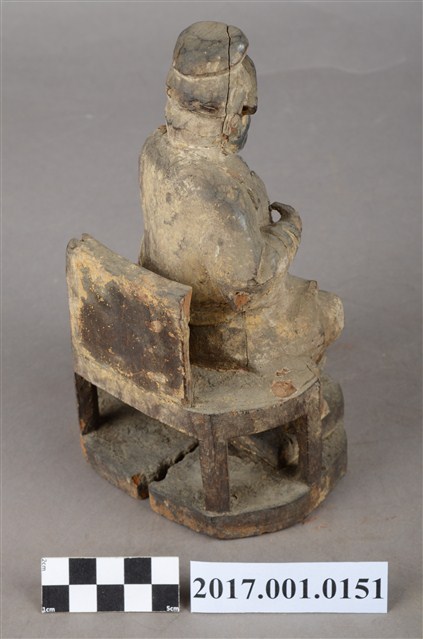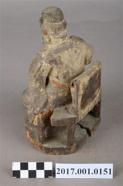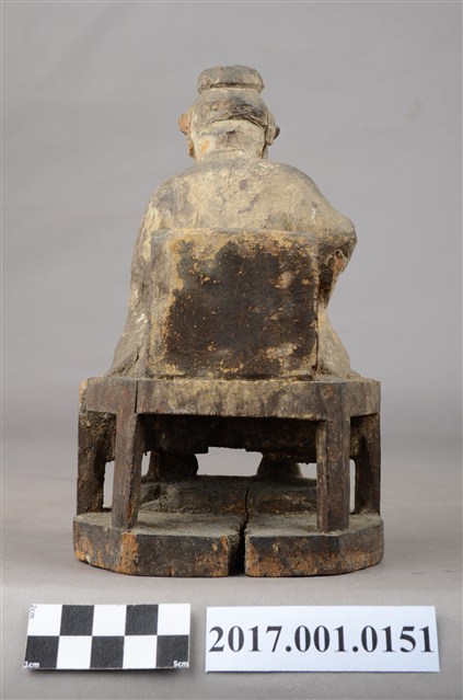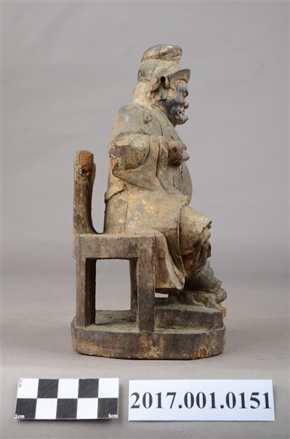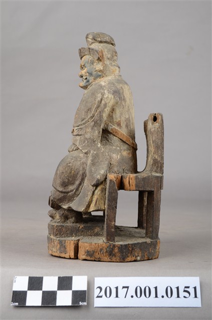 1.本件木雕王爺像採坐姿,端坐於圈背椅上,粧佛已除去。王爺臉色鐵青,無鬚,五官猙獰,雙眼瞠視,鼻頭顴骨高凸,呲牙裂嘴。頭戴兜鏊,身穿寬袖長袍,胸前有看帶,腳穿皂靴踏獸座。左手握拳置於左腿上,右手抬舉看帶。左腳向外略伸出,右腳內縮,作文武腳姿態。座前置踏几,圈背椅扶手脫落,臺座作圓矮臺,臺座後半有一道裂縫。