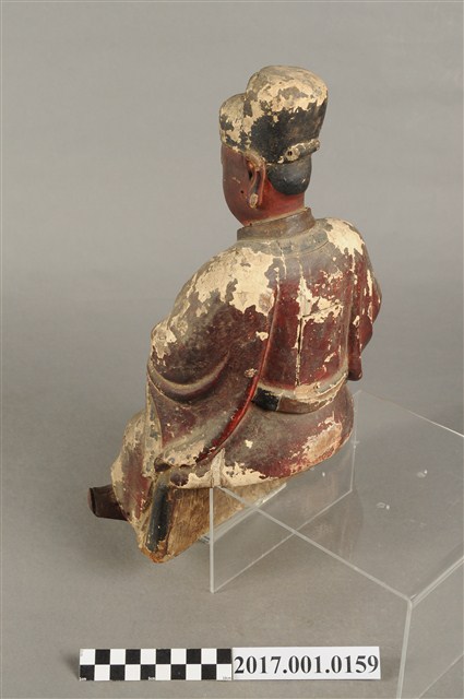 1.本件木雕王爺像採坐姿,座椅已失,袍服之粧佛局部脫落、鬍鬚脫落。王爺像作中年男子相貌,朱紅臉,雙眼圓睜,嘴部上下方分別有兩處及一處小孔作為植鬍鬚處,頭戴幞頭,帽翅缺損,身著圓領袍服,腹部束有腰帶。左手扶於左膝之上,右手小臂上舉握胸前之看帶,胸前衣袍殘留有蟒紋線條,左腿略為外伸,鞋尖翹起。
