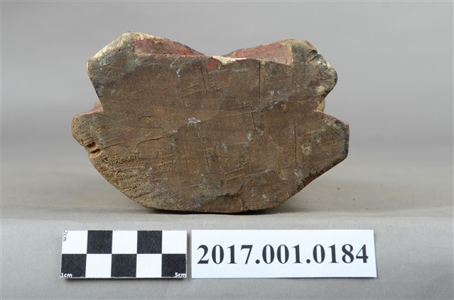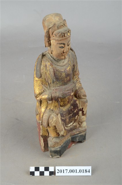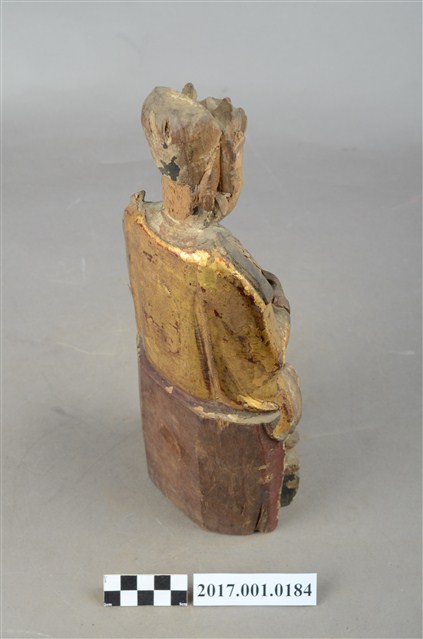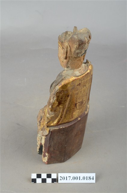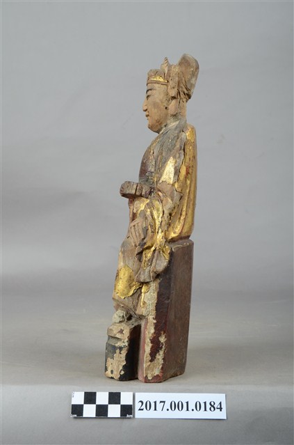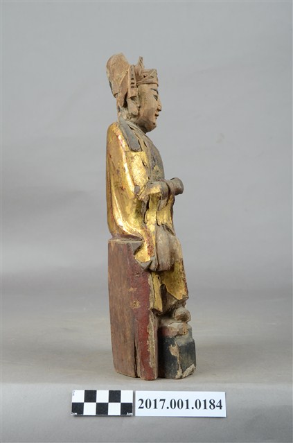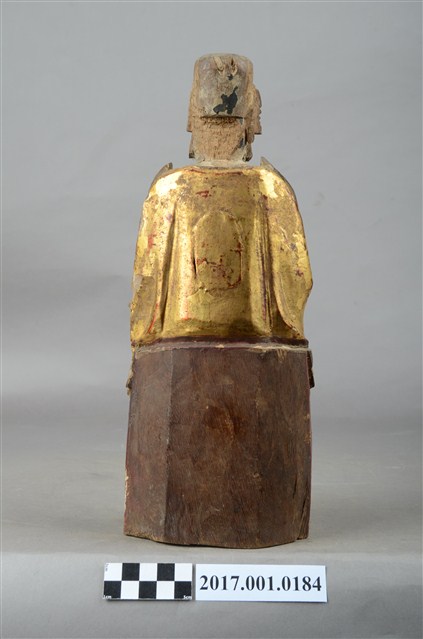 1.本件木雕王爺像採坐姿,端坐於臺座上,表面施以安金技法粧佛,安金層大部分已除去,神像背後有橢圓形入神洞,封榫尚存。王爺作中年男子相貌,嘴邊有植鬚孔,臉頰豐腴,雙眼半睜,嘴帶笑意。頭戴兜鏊,身穿圈領寬袖長袍,胸前束看帶,腳穿皂靴。左手扶於左膝上,右手小臂上抬握看帶,雙腳採正位坐姿踏踏几。臺座作半圓臺,左右兩側微內縮,正面作如意形凹槽。臺座背面貼有一張破碎標籤。