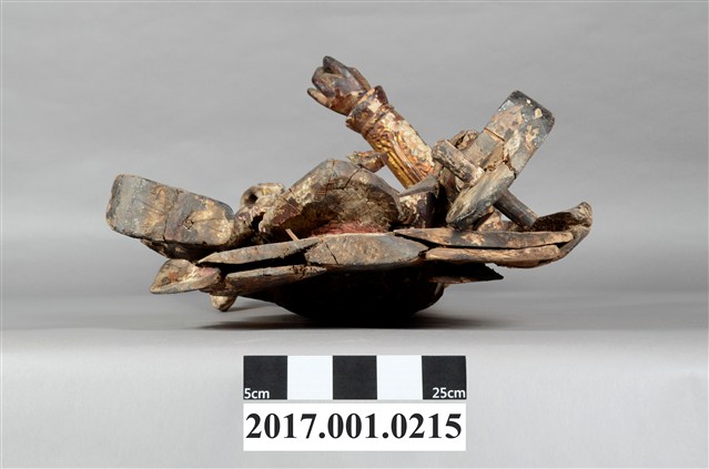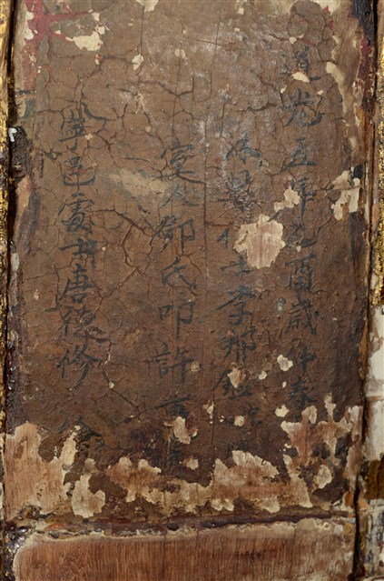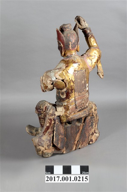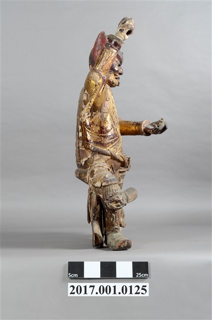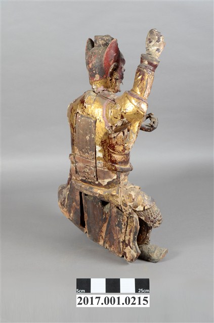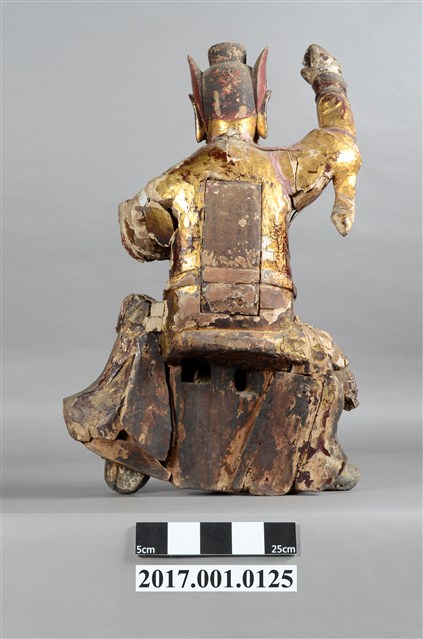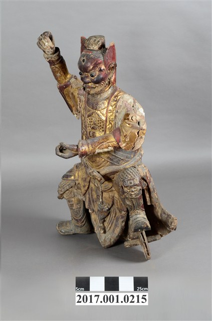 1.本件木雕王靈官像採坐姿,座椅已失,全像尺寸較大,由數塊木材組合而成,上臂及腰部可見接合木榫,袍服安金局部脫落,雙手手臂與身軀交接處有裂紋,以數片長金屬片固定,背後開有長方形入神洞,封榫尚存,其上有四行墨書題字。王靈官像作三眼武將造形,絳紅色臉,嘴邊殘留有植鬚,雙眼圓睜,上額中央作第三隻眼,眼珠以玻璃珠植入。雙鬢朝天,頭戴小冠,身著鎧甲罩衫,腳穿戰靴,腰部束一條龍形腰帶,腰下垂一條蔽膝前襠。左手橫伸於胸前,手掌朝上結靈官指,右手上舉,手掌虛握過頭,作握鞭狀,鐵鞭已失。雙腿外張,左腿上抬踏一只圓輪。入神洞封榫墨書「道光五年乙酉歲仲春□ 沐恩信士李邦鑑□□ 室人鄧氏叩許重□ 寧邑處士唐德修」,說明神像修造年代、起造人與重修者,寧邑即今中國河南省新鄉市穫嘉縣。