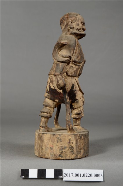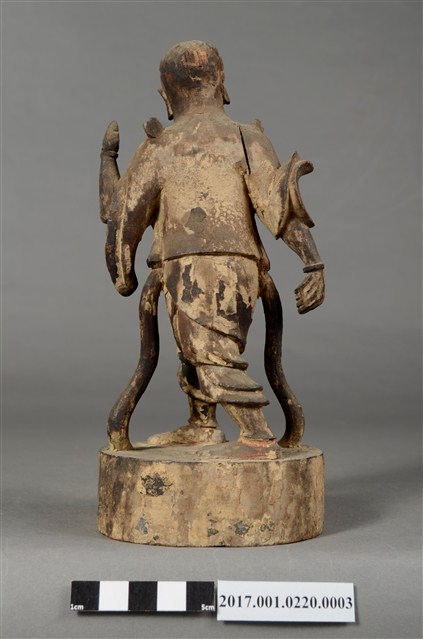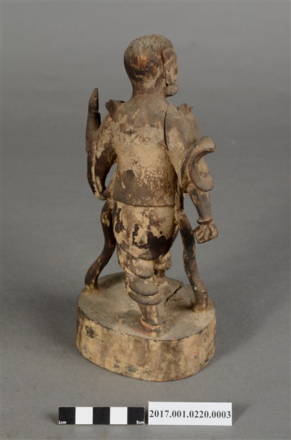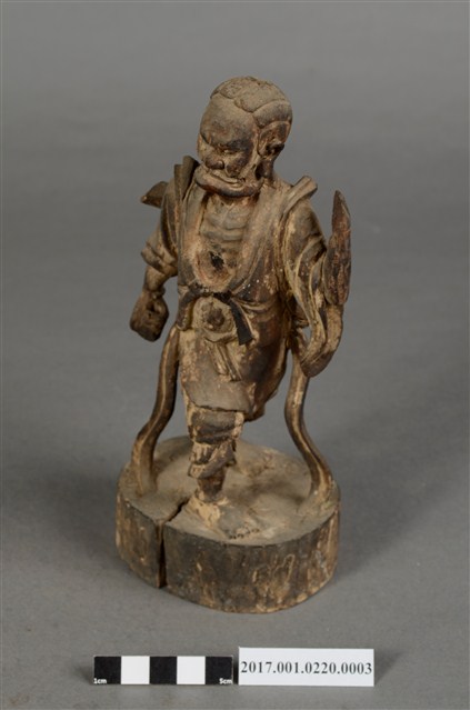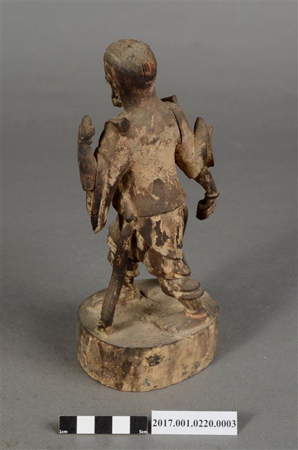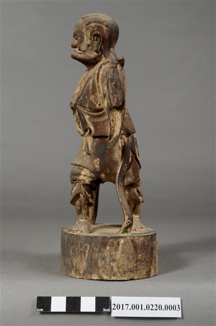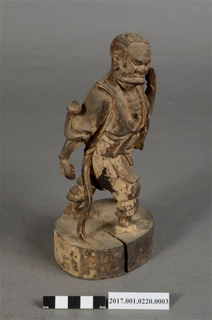 1.本件順風耳像為木雕製成,表面粉線彩繪等粧佛已經剝落。順風耳作側耳傾聽貌,披頭散髮,五官凹陷,眼睛瞪大,面目猙獰。身穿短褐,身披飄帶,袒胸露出肋骨與腹部,下身穿著束腰半長褲,雙腳跣足,右腳在前、左腳在後,腳掌踩於地面,姿態生動。左臂抬起,上肢斷裂,右手則低握,手中武器遺失。臺座貼有順風耳標籤。