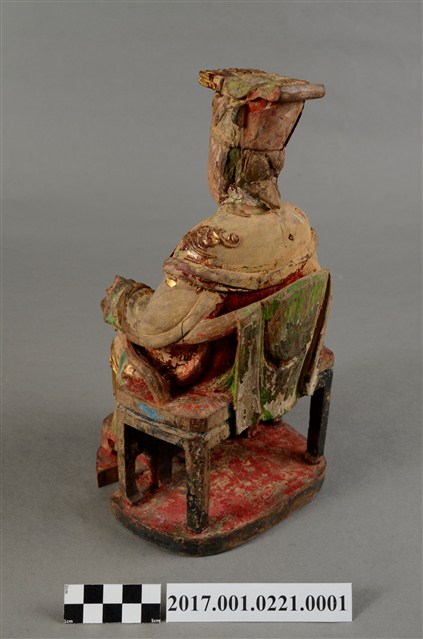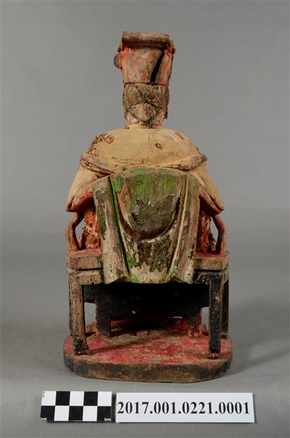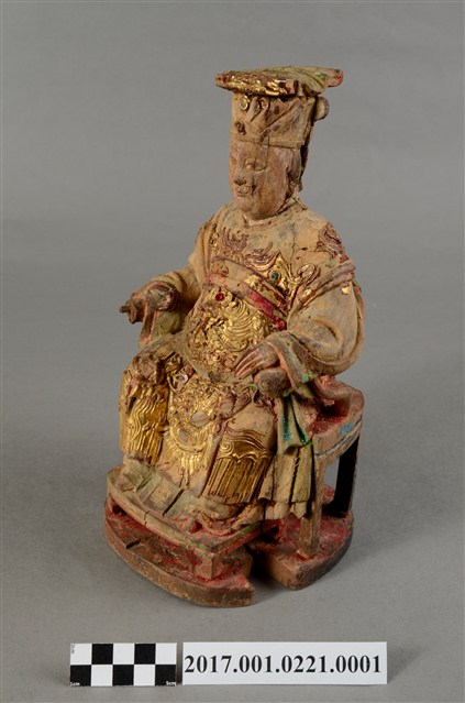 1.本件天上聖母像為木雕製成,表面以安金粉線彩繪粧佛,粧佛已部分剝落。媽祖臉色褪去,雙目微睜,神態穩重,頭戴冕冠,腦後垂髮髻。媽祖身穿蟒袍,腹下束腰帶,胸前有看帶,左手扶於座椅扶手,右手掌虛握朝上,持物已失。神像手勢採平放式姿態,端坐於綠色圈背椅,雙足踏於踏几上,露出弓鞋,蟒袍的蟒紋以粉線安金飾成。衣摺線條流暢生動。