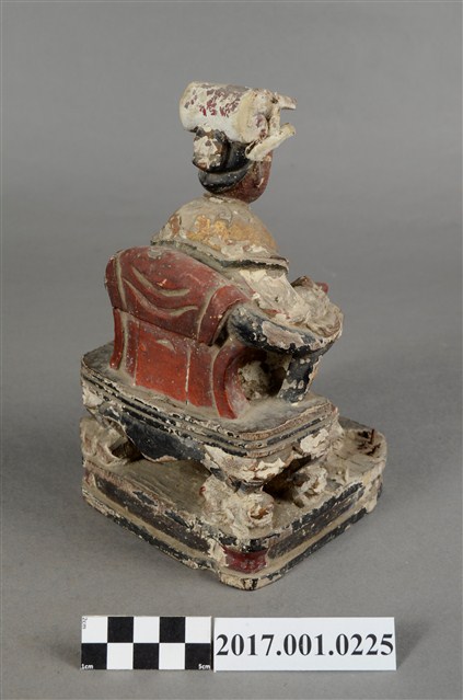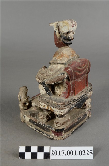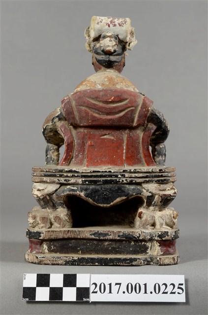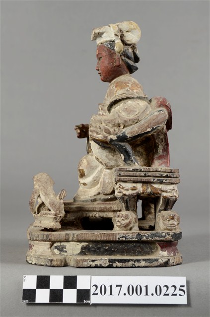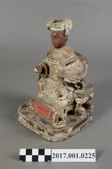 1.本件天上聖母像為木雕製成,表面以安金粉線彩繪粧佛,粧佛部分剝落。媽祖臉色粉嫩,雙目垂視,神態莊嚴肅穆,頭戴冕冠,耳旁鳳翅斷裂。身穿蟒袍,腹下束腰帶,胸前有看帶,雙肘平靠於扶手,左手掌削落,右手掌輕握,手中持物已失。神像作如意體,端坐於圈背椅,雙足踏於踏几上。踏几前雕有金獅,右方金獅遺失,圈背椅腿部作獅吞造形。蟒袍的蟒紋以粉線飾成,衣摺線條流暢,造形華麗。