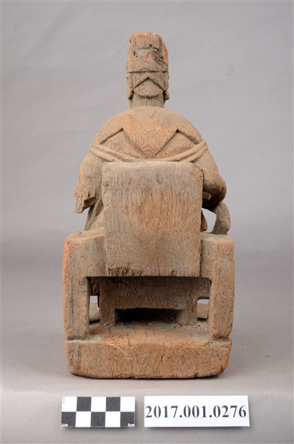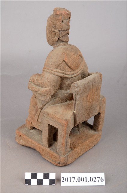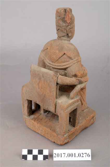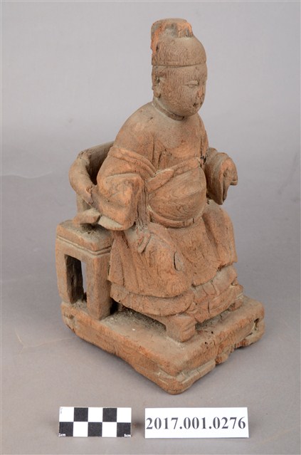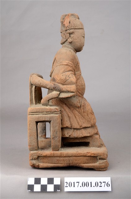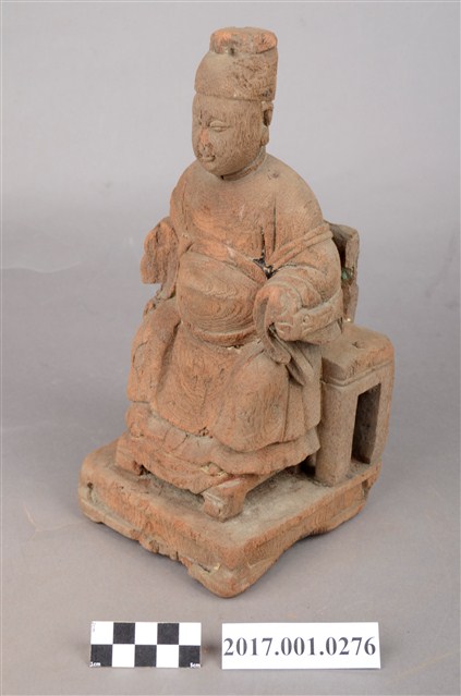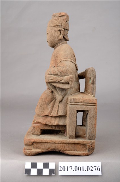 1.本件木雕天上聖母像採坐姿,表面粧佛已脫落,鼻部缺損,座椅左側支條斷裂。聖母端坐於圈背椅上,椅下臺座的底部平整,但有蛀蝕現象。天上聖母端坐,雙足自然下垂,腳著弓鞋,足下踩有一小型踏几。聖母臉型圓潤,臉孔娟秀,頭戴幞頭,腦後垂有尖尾髻。身著圓領袍服長裙,腰束腰帶,胸前束看帶,兩臂披長飄帶,垂於兩腋下,雙手分別靠在扶手上,手掌削除。