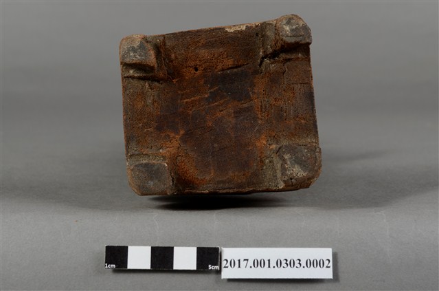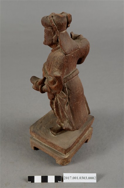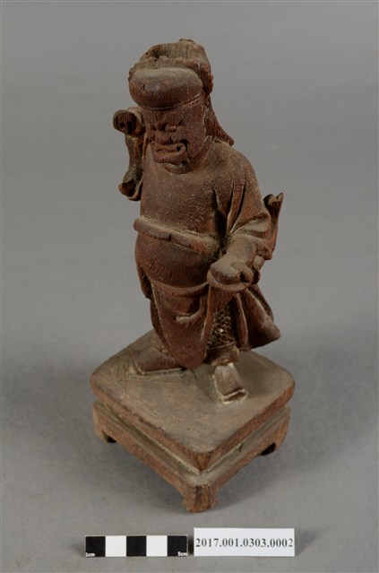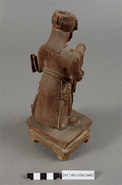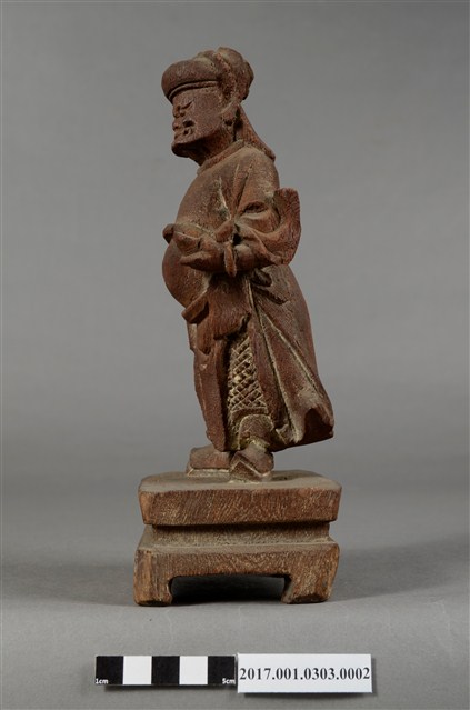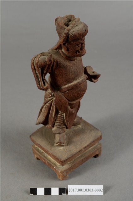 1.本件順風耳像為木雕製成,表面的粧佛褪去,顏色黝黑。眼窩凹陷,眼睛瞪大,張嘴微露獠牙,望向左方。頭戴幞頭,身穿官袍,腳穿皂靴。左手握持元寶,右手高舉,前臂斷裂。