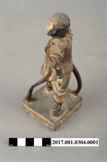 1.本件千里眼像為木雕製成,體積嬌小,表面粧佛褪去。千里眼作抬頭眺望貌,臉部風化模糊。身穿短褐,身披飄帶,袒胸露出肋骨與腹部,下身穿著束腰長褲,跣足,左腳在前,右腳在後,踩於臺座,姿態生動。右臂高抬過頭,上肢斷裂,左手則低握,手中武器遺失。