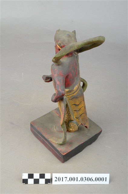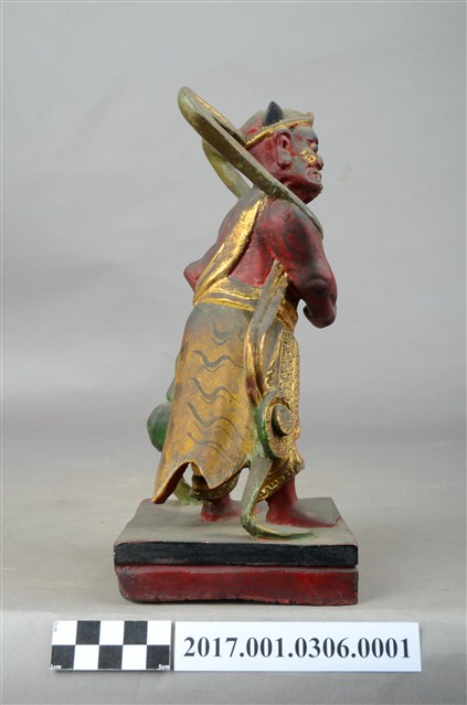 1.本件千里眼像為木雕,表面以粉雕安金彩繪粧佛製成。千里眼通體綠色,臉部點七星,頭戴金箍,頭生單角,作側耳傾聽貌。五官凸出,眼睛瞪大,面目猙獰。偏袒右肩,披飄帶,露出肋骨與腹部,下身穿著束腰半長褲,雙腳跣足,左腳在前,右腳在後,踩於地面,姿態生動。左手置於眼前作俯瞰貌,右手抓住左飄帶,整體造形姿態生動。