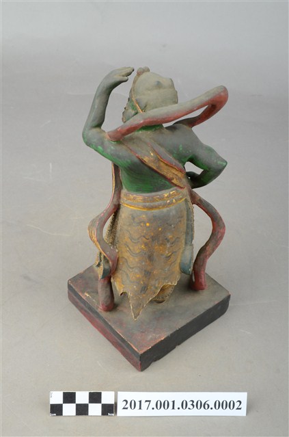1.本件順風耳像為木雕,表面以粉雕安金彩繪粧佛製成。順風耳通體紅色,臉部點七星,頭戴金箍,頭生雙角,作側耳傾聽貌。五官凸出,眼睛瞪大,面目猙獰。順風耳偏袒左肩,披飄帶,露出肋骨與腹部,下身穿著束腰半長褲,雙腳跣足,右腳在前,左腳在後,踩於地面,姿態生動。雙手置於身體左側作服侍狀,整體造形姿態生動。