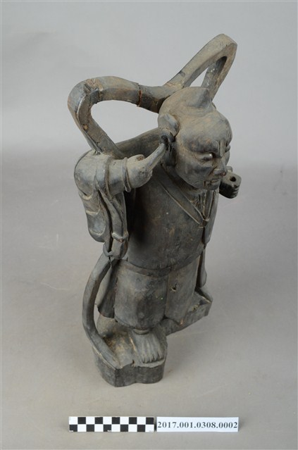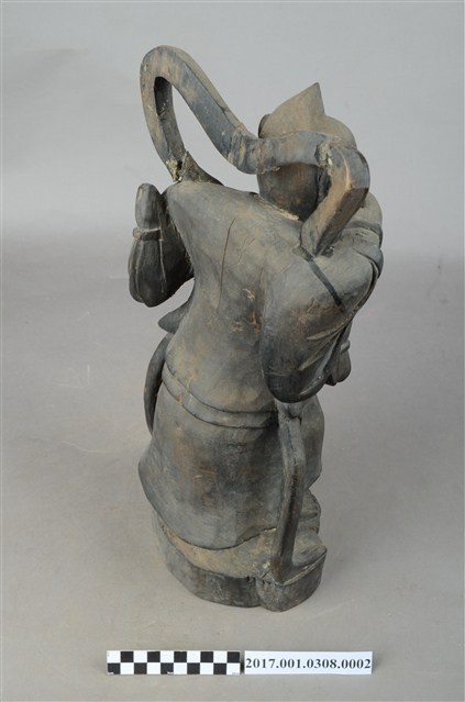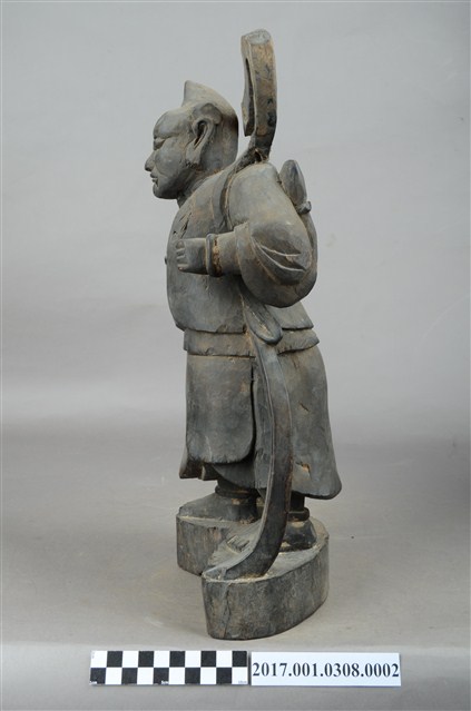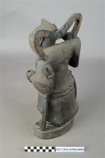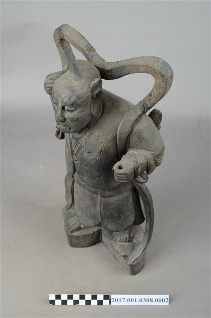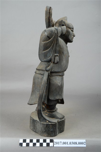1.本件順風耳像為木雕製成,表面顏色黝黑。頭生獨角,眼睛瞪大,面目猙獰。右手伸食指與中指(劍指)指向眼睛,左手小臂前舉,握拳作持物狀。身穿短褐,身著罩衫,披飄帶,下身穿著長褲、短裙,雙腳跣足,踩於地面,姿態生動。