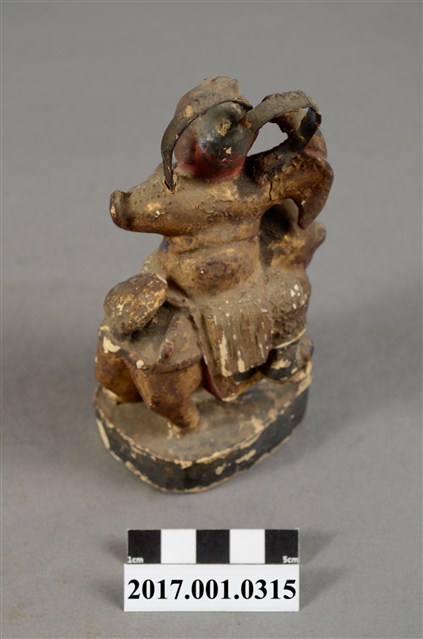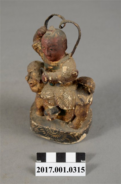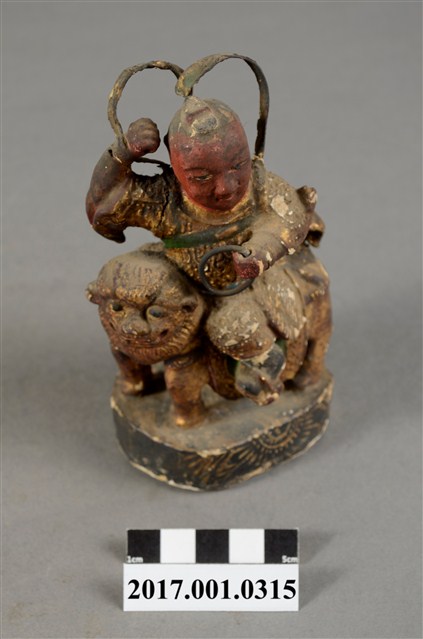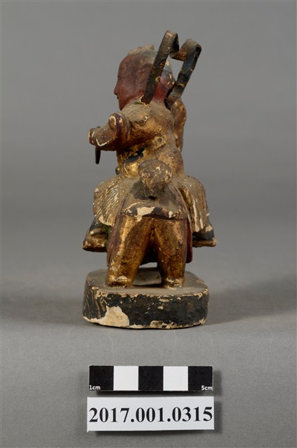1.本件木雕中壇元帥像,作騎獅姿態,表面施作塗裝、安金不見紅粉粧佛技法。臉型輪廓橢圓。元帥作幼年童子相貌,五官呈現稚氣貌。頭頂梳髻,身作「衷甲」式的裝束,身著鎧甲,外套著窄袖蟒袍,在左腿處露出鎧甲,肚腹圓凸,腹下束腰帶。跨坐於獅背上,左手握乾坤圈橫伸向右,右手握拳持物高舉,持物遺失,袖擺因手勢動作而擺動。獅子四足站立於臺座上。臺座前方白漆勾勒圖紋。