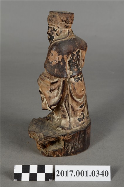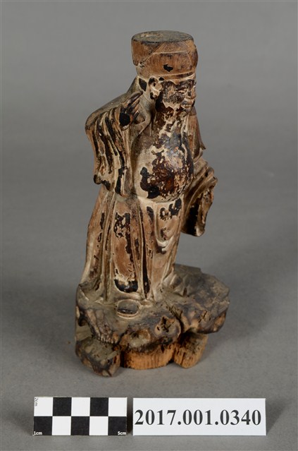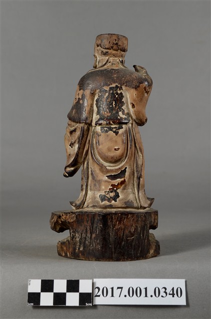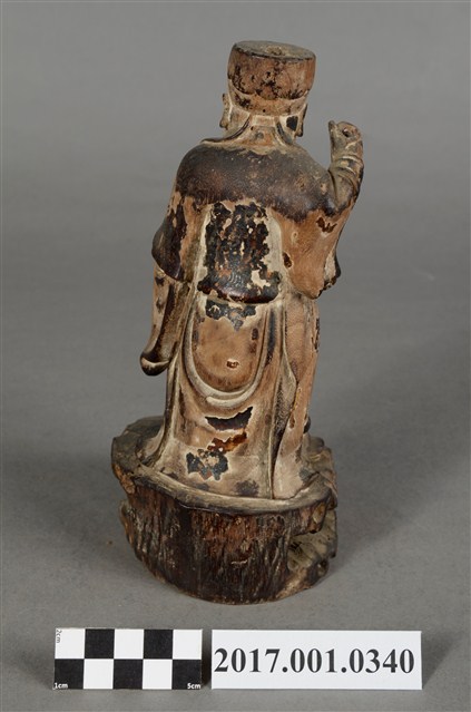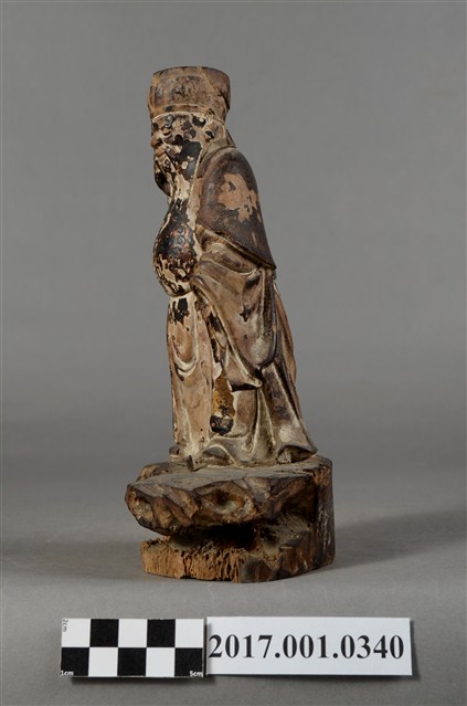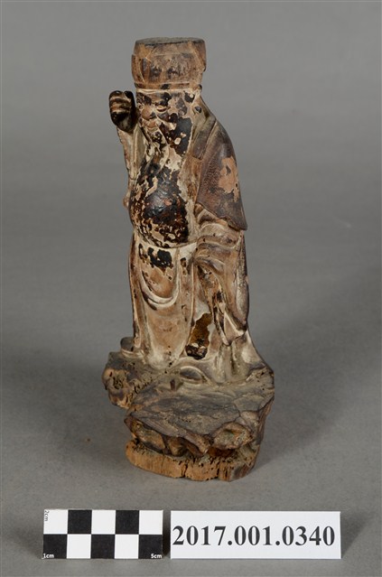 1.本件木雕月老尊神像採立姿,站立於不規則形之岩座上,表面粧佛大面積褪去,左手持物遺失,左腳前方岩座上凸出一根短卯,其上原有安置其他物件,臺座下端前方蛀蝕缺損。月老尊神作老者相貌,頭部稍轉向左方,大耳、嘴部周圍及下額雕有長髯,上額做抬頭紋,雙眼慈祥,嘴帶笑意。頭戴東坡巾,與一般常見之類似南極仙翁之禿頂造形有異,身著寬袖長袍,腹部圓凸。左手下垂,手掌缺損,右手小臂上舉,手掌虛握,作握柺杖狀,柺杖已失。左足前伸,作丁字步姿態。