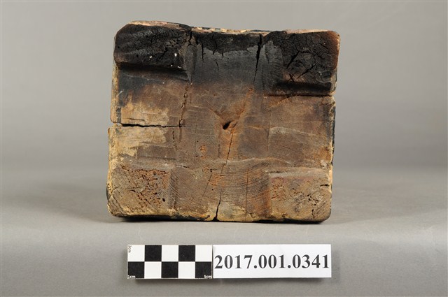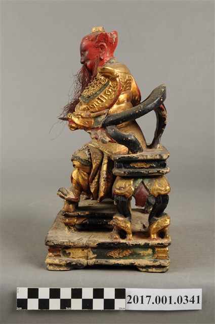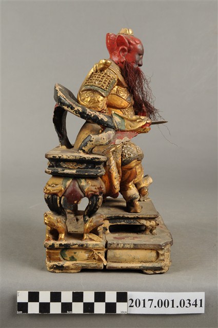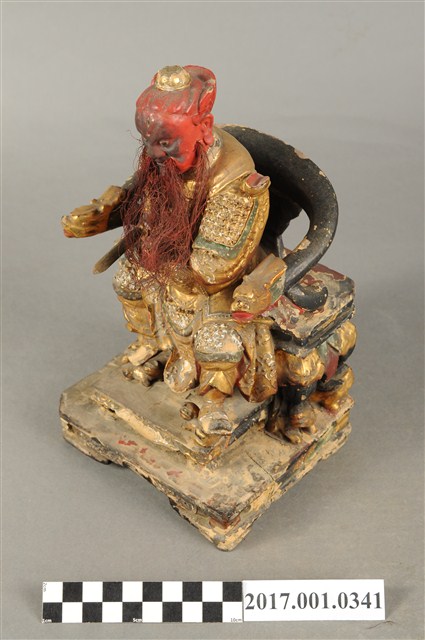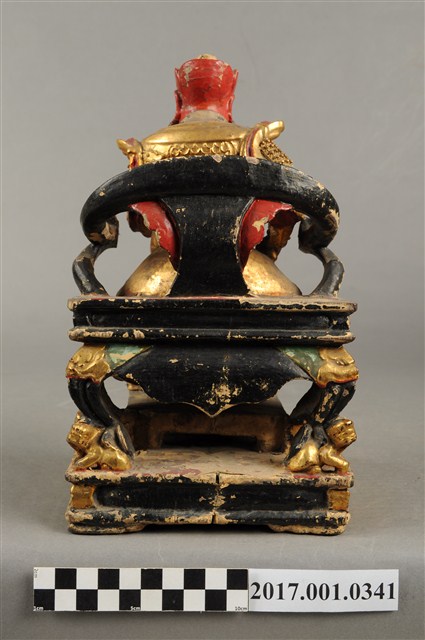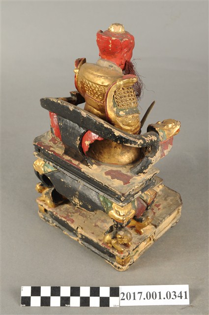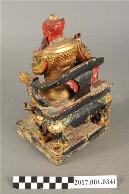 1.本件木雕火德星君像採坐姿,端坐於龍頭圈背椅上,表面粧佛保存狀況尚佳,臺座底部有數道裂紋。星君作三眼武將造形,類似王靈官,絳紅色臉,雙眼圓睜,上額中央有第三隻眼。頭戴蓮花道冠,臉蓄五柳紅色長髯,雙鬢朝天。上身稍向前傾,身著窄袖長袍外罩鎧甲,左手橫伸於腹前,手掌朝上握一只火珠,右手下垂曲肘,手掌置於右腿上,握一把短劍,劍尖朝前。雙腳踏於座前踏几之對獅上,左腳外伸,右腳內縮,作文武腳姿態。