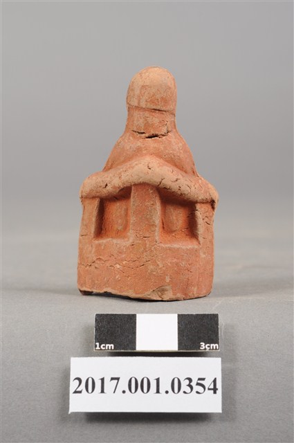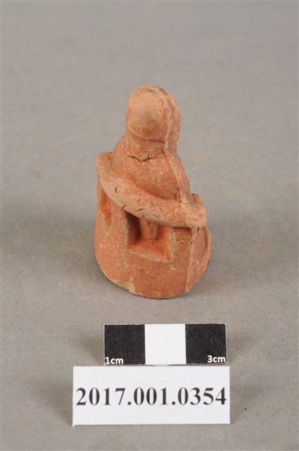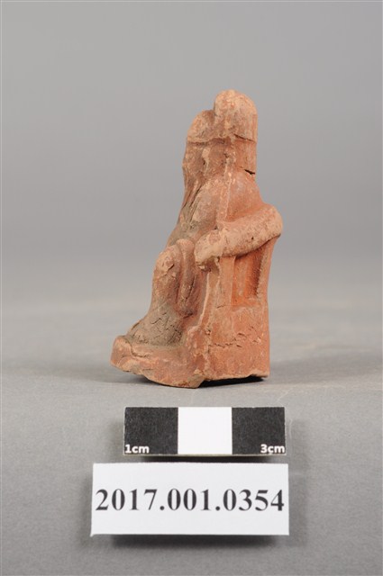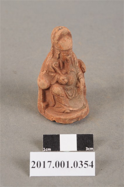 1.本件文昌帝君像為磚燒。神像造型嬌小古樸。文昌帝君頭戴幞頭,蓄有長髯,面帶微笑,神態安詳,五官神情細緻。文昌帝君身穿長袍,側端坐於圈背椅上,長袍衣褶線條自然,右手持如意,左手按於左膝,雙足踏於地上。神像底部中空,是為避免磚燒過程爆裂。