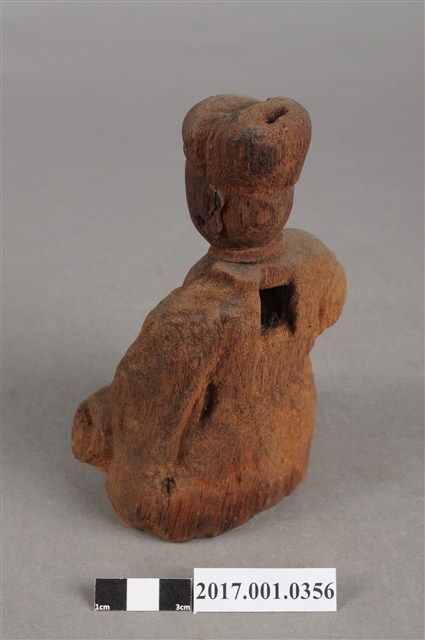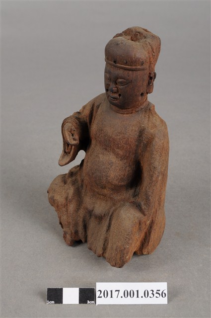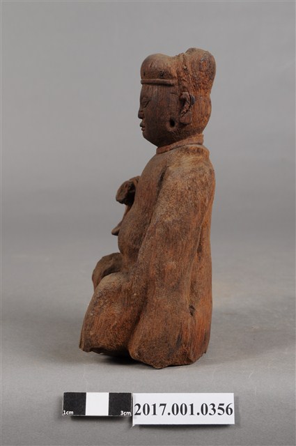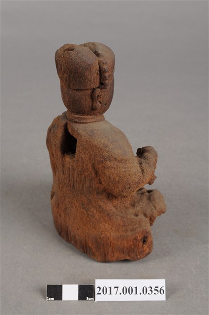 1.本件木雕文昌帝君像,作坐姿姿態,坐於臺座上,表面損毀,背部開有方形入神洞,封榫佚失,內容物件已取出。顏面表現雙目半睜,法令紋深邃,鼻翼兩側、下顎、兩頰有植鬚孔,鬍鬚已失。頭戴幞頭,冠上有額子,身著盤領衣,肚腹圓凸,胸前束看帶,腰繫腰帶,腳穿皂靴。挺身端坐,雙足與袍府下襬蛀蝕缺損。左手掌無法辨識是否持物,右手高舉握著看帶。