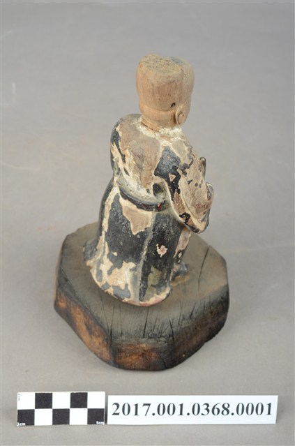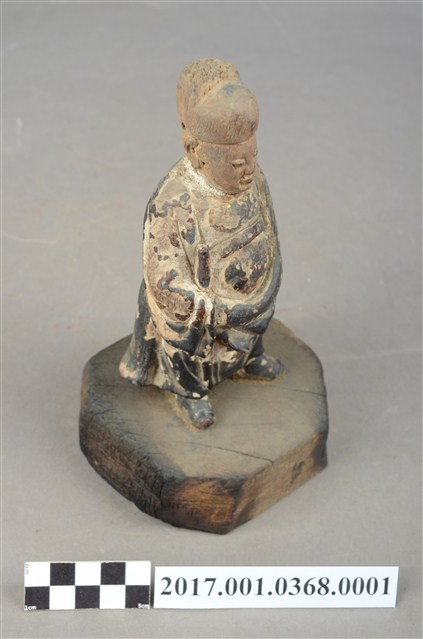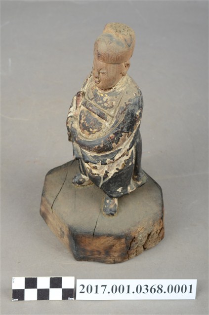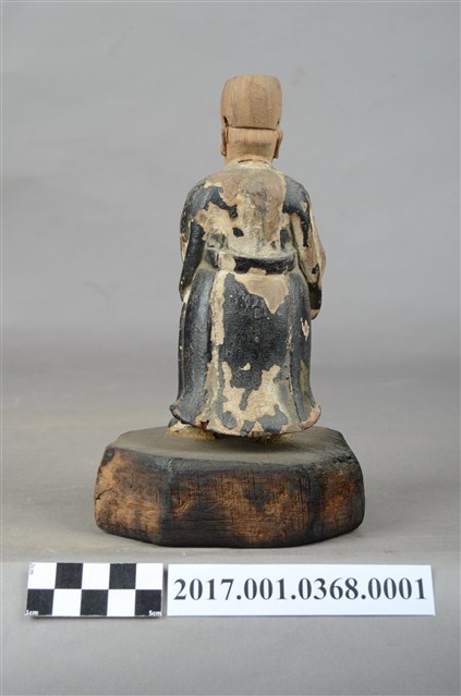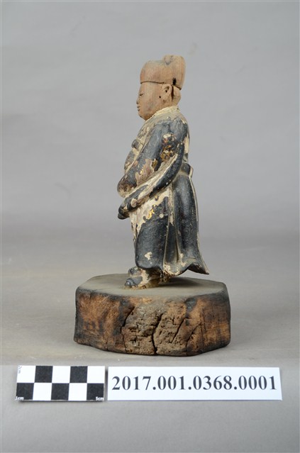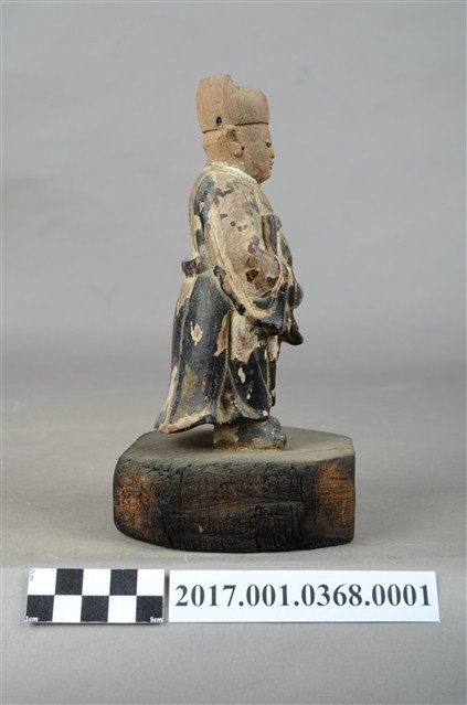 1.本件木雕文判官像,作立姿姿態,表面粧佛已褪去,僅存部分平塗漆面。雙目半睁。頭戴幞頭,幞頭後有孔,推測原有組裝帽翅,身著盤領衣,肚腹圓凸頂著腰帶,腳穿皂靴。立像挺身以雙腳八字步的姿態站於臺座上,雙手藏於袖內,左手右伸而使衣袖向左飄動,雙手環抱於腰際,此種體態稱為抱袖體或通壽體,書卷置於右手手臂。