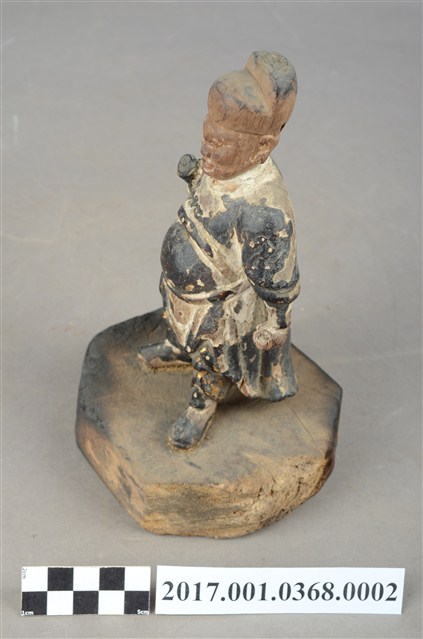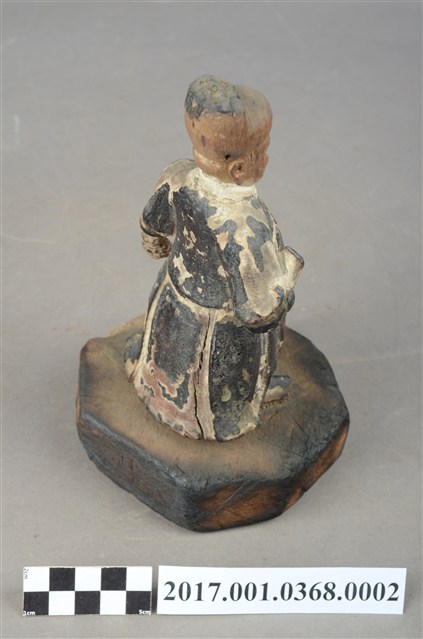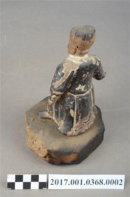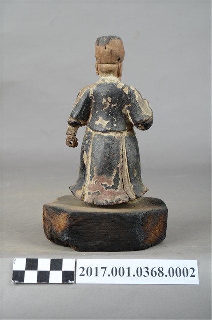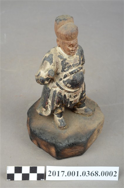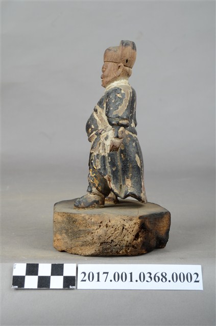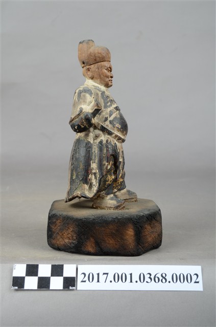 1.本件木雕武判官像,作立姿姿態,表面施作塗裝、安金不見紅粧佛技法。頭部的粧佛已褪去,漆面與安金剝落嚴重。雙眼瞠目,皺眉,顴骨與頦肌凸出,法令紋深邃,表現出壯年男性嗔怒的相貌。頭頂戴幞頭,幞頭後有孔,推測原有組裝帽翅,身著窄袖盤領衣,腹圍看帶、腰繫腰帶,雙足著長褲,腳穿皂靴。立像挺身以雙腳分立的姿態站於臺座上,左手握拳向下,左手舉起,左手掌缺損。