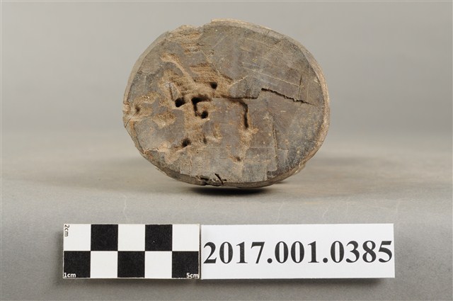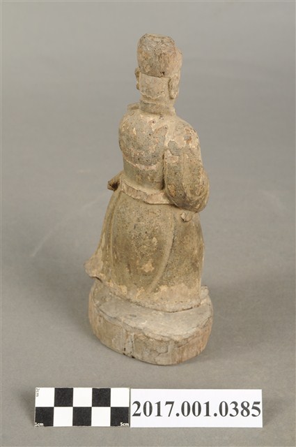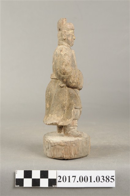 1.本件木雕文判官像,作立姿姿態,表面粧佛已褪去,造像的後腦、背部等處蛀蝕。雙目半睁。頭戴幞頭,幞頭後有兩個孔研判原應有組裝帽翅,身著盤領衣,腰繫腰帶,腳穿皂靴。立像挺身以雙腳八字步的姿態站於臺座上,雙手藏於袖內,左手右伸,雙手環抱於腰際,此種體態稱為抱袖體或通壽體,左手臂夾著書冊。臺座平面為圓形。