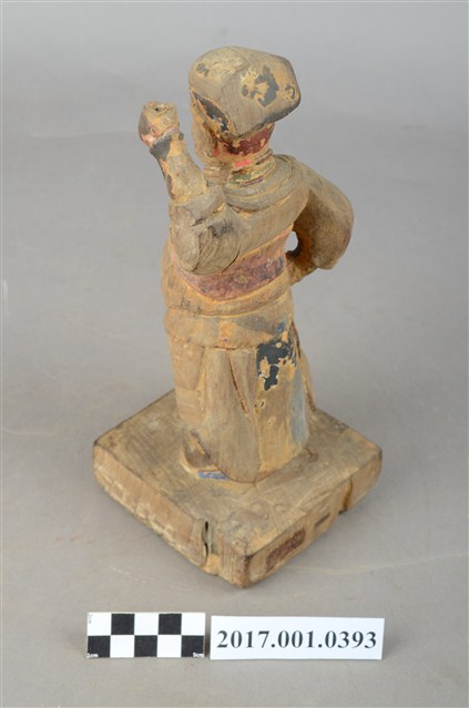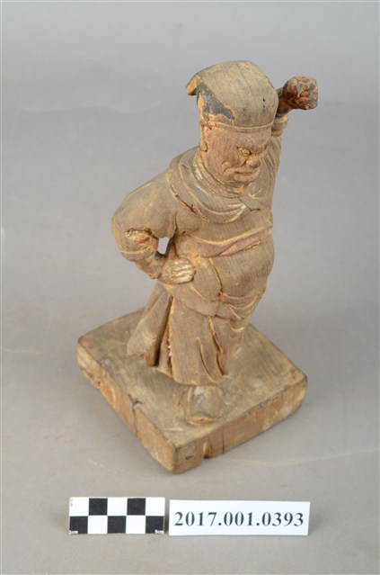 1.本件木雕武判官像,作立姿姿態,表面粧佛已褪去。頭部微側,雙眼瞠目,皺眉,顴骨與頦肌凸出,法令紋深邃,表現出壯年男性嗔怒的相貌。頭頂戴方巾,身著窄袖長袍,肩披布巾,腰部圍著護腹,護腹以腰帶固定,腳穿皂靴,下半身表現出袍服一層層的衣折紋路。立像挺身以雙足丁字步的姿態站於臺座上,左腳在後、右腳在前,右手插腰,左手握拳高舉,持物已失。臺座平面近似方形。