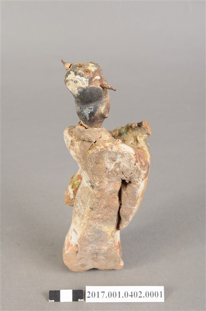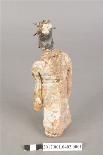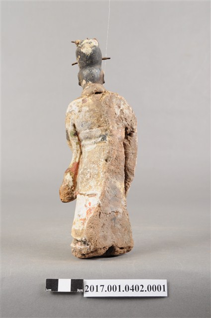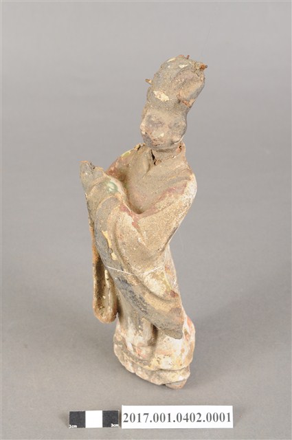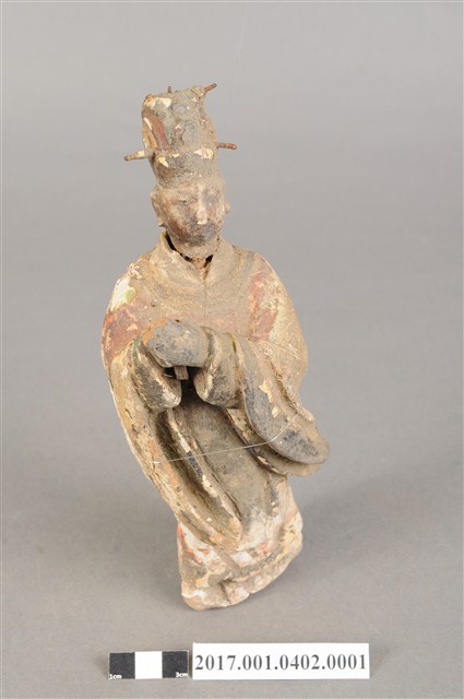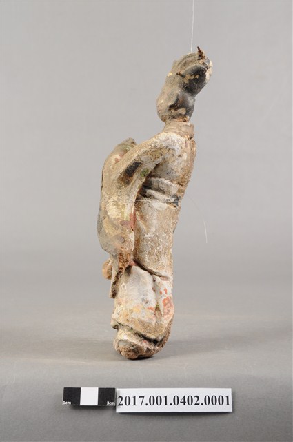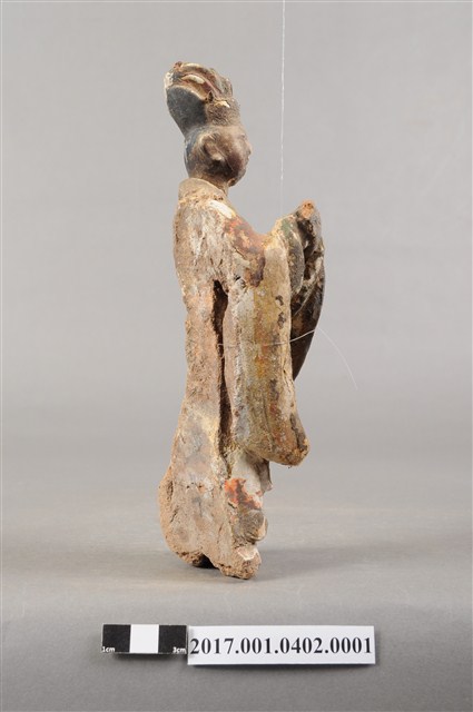 1.本件泥塑文官侍從像,作立姿姿態,表面粧佛剝落。頭部微側向右,五官已模糊不清。頭戴梁冠,梁冠左右有金屬簪,上半身著右衽寬袖衣,腰束腰帶,下半身著裙裳,裳前有蔽膝,雙腳穿履。立像挺身以雙足分立的姿態站立,身軀側身向右,左手右伸,雙手交握於胸前,左手掌在前,作揖。
