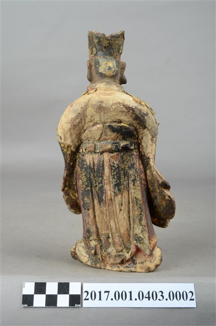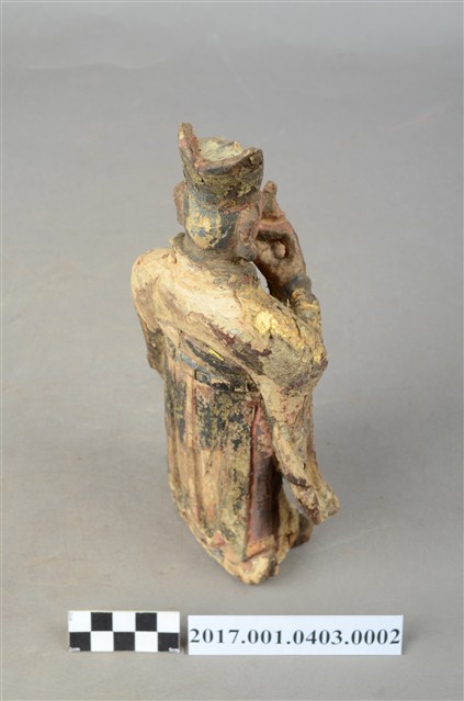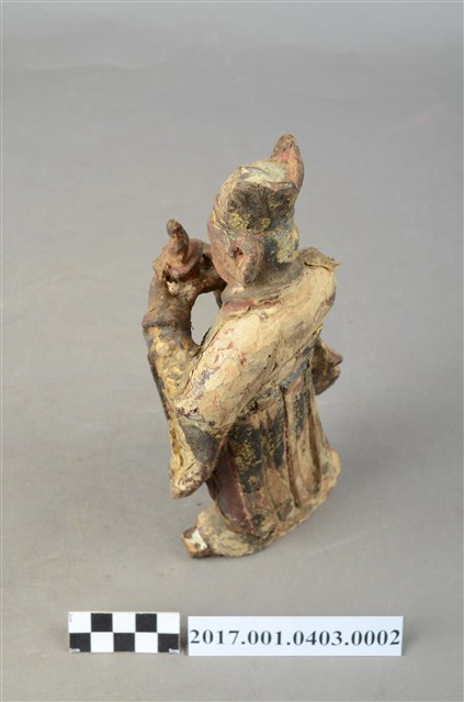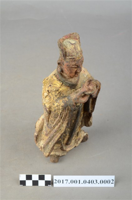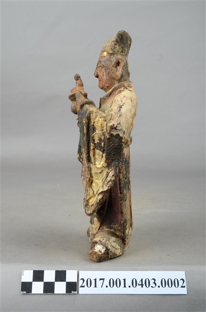 2.文官為中國古代文職官員之泛稱,與武將相對,有品級之分。在神祇供奉型態中,文官多作為主神之從祀,多無名諱。此件文官依據其帽冠、袍服形式,應為帝級神祇之脅祀,如玉皇大帝、三官大帝等。(富俐崴文化事業有限公司/謝宗榮計畫主持)