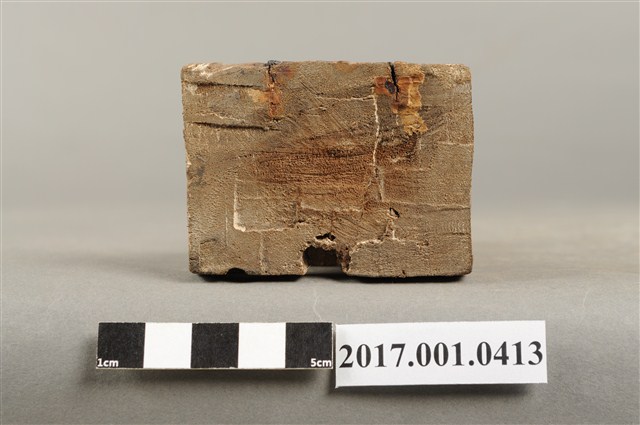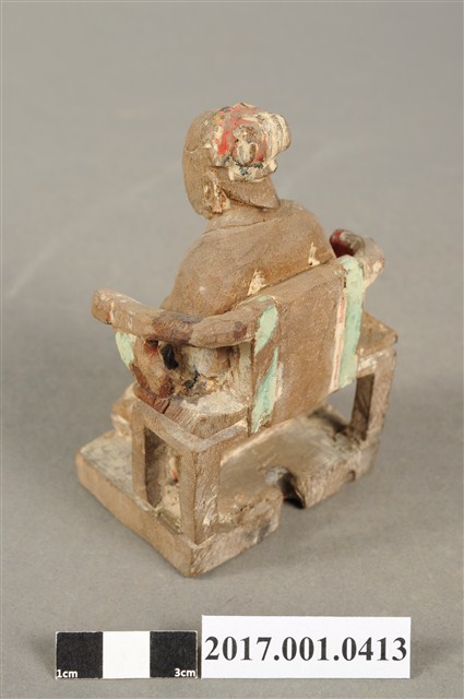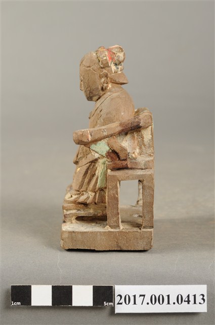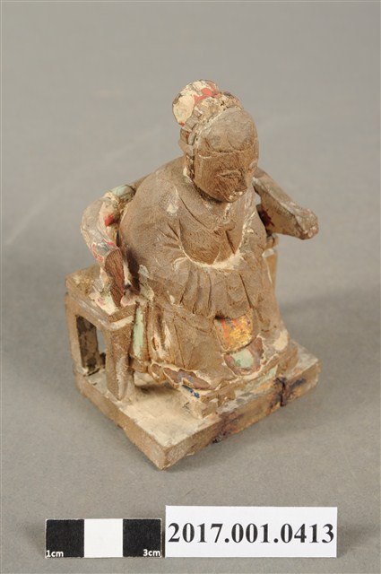 1.本件木雕夫人媽像採坐姿,尺寸微小,表面粧佛已脫落。夫人媽坐於一圈背椅上,下端鏤空,椅下另有一大型的方形臺座,底部平整,但有蛀蝕現象。夫人媽端坐,臉型圓潤,臉孔娟秀。頭梳髮髻,戴有髮飾。身著圓領袍服、長裙,外罩對襟罩衫,袍服下襬前方殘留彩繪、安金。雙手交握,手掌藏於衣袖內。雙足自然下垂,腳著弓鞋,足下踩一小型踏几。
