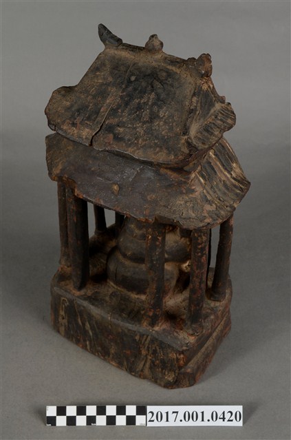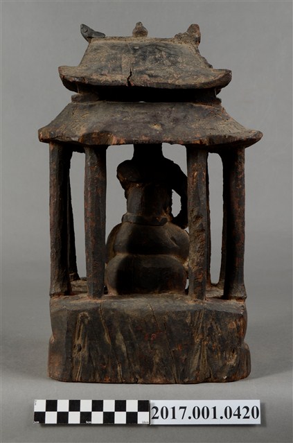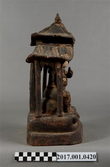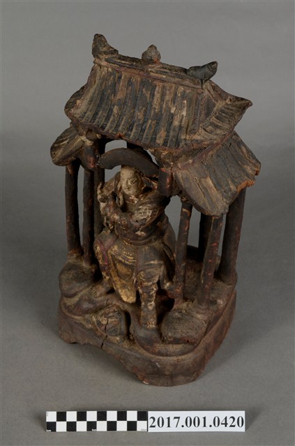1.本件木雕玄天上帝像,作坐姿姿態,表面施作塗裝、安金不見紅粧佛技法,局部粧佛剝落。臉型輪廓橢圓,顏面表現雙目半睜,披髮,身著盤領衣,雙腳著長褲,肩頸披著披膊與護肩,腰束腰帶,護腹以腰帶固定,正面的腰帶下有前擋與左右擋鎧甲,鎧甲表現甲冑紋,跣足,端坐於臺座上。挺身端坐,左腳向斜前方外推、右腳向內,作「文武腳」姿態,左手捻指訣橫伸向右,右手握拳持物屈肘向下,持物已遺失,雙手袖口向後揚起。座前下方有龜蛇盤繞。本件有雕塑八柱歇山重簷亭軒,神像安奉於建築內。臺座雕刻雲朵,使建築物如同雲中宮闕。