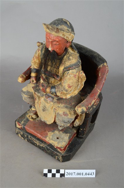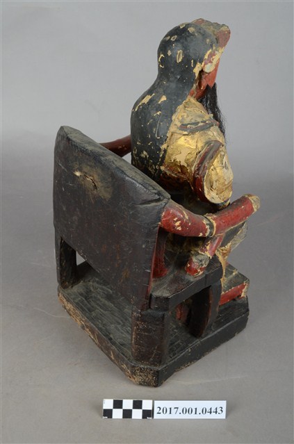 1.本件木雕玄天上帝像,採坐姿姿態,坐於圈背椅上,表面施作塗裝、安金不見紅粉線盤飾粧佛技法,局部粧佛剝落。臉型輪廓橢圓,顏面表現雙目半睜,鼻翼兩側、下顎、兩頰有植鬚。頭戴兜鍪,披髮,身著盤領衣、雙腳著長褲,肚腹圓凸頂著看帶,腰束腰帶,護腹以腰帶固定,披飄帶,跣足。雙足垂下,左腳損毀,右腳踏著蛇,左手橫於腹前,手掌結特有之玄帝指,右手握拳持物屈肘向下,持物已遺失,衣袖向後揚起。圈背椅的扶手出頭可拔出,椅前有踏几,踏几上有洞,是為固定烏龜之用。臺座為方臺,座前彩繪寶相花紋,底部遭受蛀蝕。