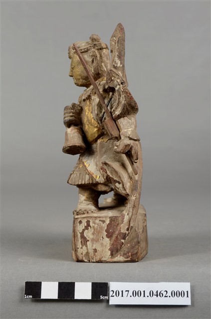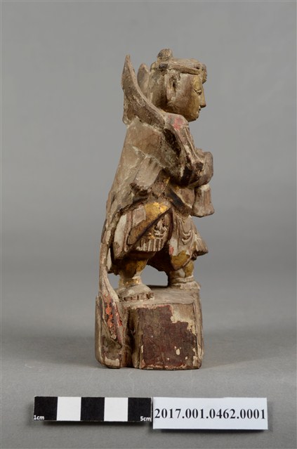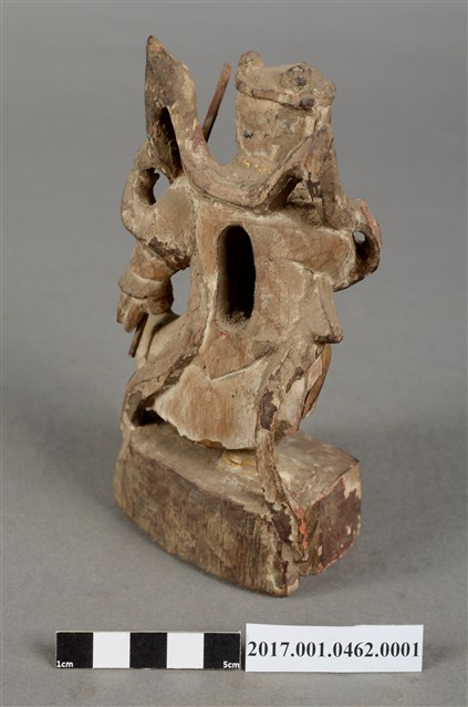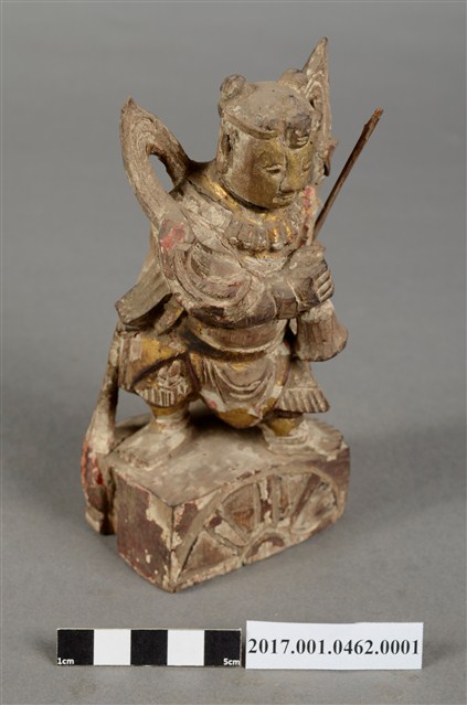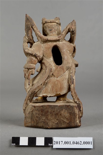 1.本件木雕殷元帥像作立姿,粧佛已除去,神像背後有一長圓形入神洞,入神物已取出。殷元帥作清秀少年相貌,雙頰有肉,雙目半睜,表情淡然。元帥頭戴人頭箍,作三頭造形,頭梳雙髻。身穿甲袍,披飄帶,頸部戴有項圈,腳穿皂靴。左手下垂持劍於身左,右手持帝鐘於胸前,左腳向前跨步,右腳在後,作丁字步姿態,站立於地面上。臺座作高方臺,前方飾有日出紋樣,貼有標籤寫「葉□帥」