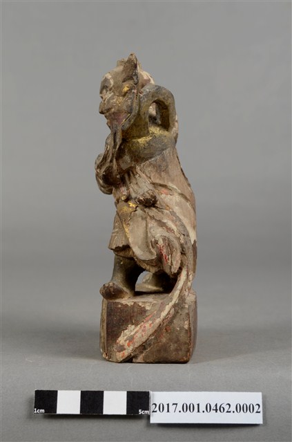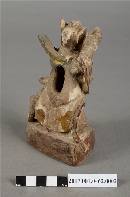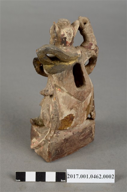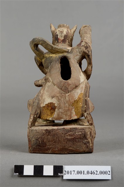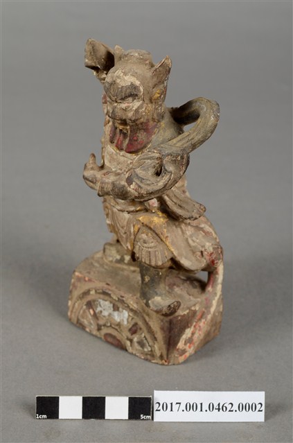 1.本件木雕王元帥像作立姿,粧佛大部分除去,神像背後有一長圓形入神洞,入神物已取出。元帥作中年男子相貌,赤髮大耳,雙鬢朝天,臉部雕有紅鬚,雙目瞠視,鼻頭、顴骨凸出,表情威嚴。頭戴小冠,肩披飄帶,身穿甲袍,雙足穿皂靴,踏於地面上。左手橫伸於胸前,結天君指法,右手握拳高舉於頭部右側,手中持物遺失。左腳向左前方跨出,右腳在後,作丁字步姿態,站立於臺座上。臺座作高方臺,前方雕有日出紋樣。
