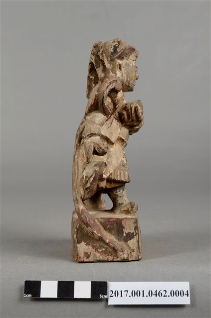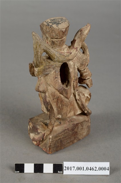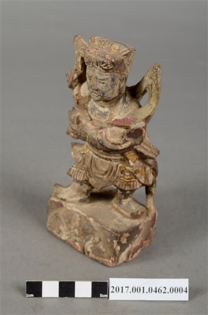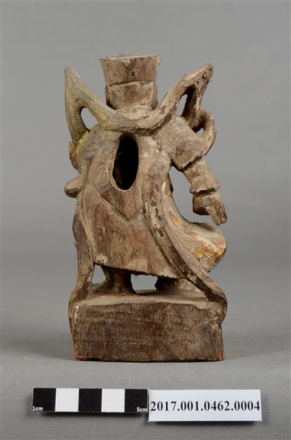 1.本件木雕馬元帥像作立姿,粧佛大部分除去,神像背後有一長圓形入神洞,入神物已取出。元帥作青年男子相貌,無鬚,雙眼瞠視,表情堅毅。頭戴幞頭,肩披飄帶,身穿甲袍,雙足穿皂靴,踏於地面上。左手持三角金磚置於胸前,右手下垂,手指作劍訣朝下。右腳向前跨步,左腳在後,作丁字步姿態,站立於臺座上。臺座作高方臺,前方雕有日出紋樣。