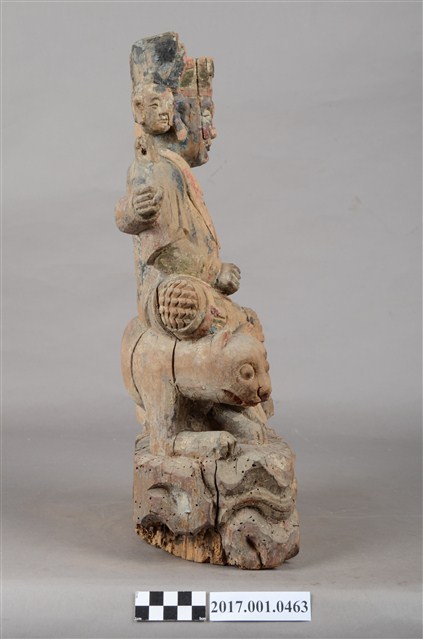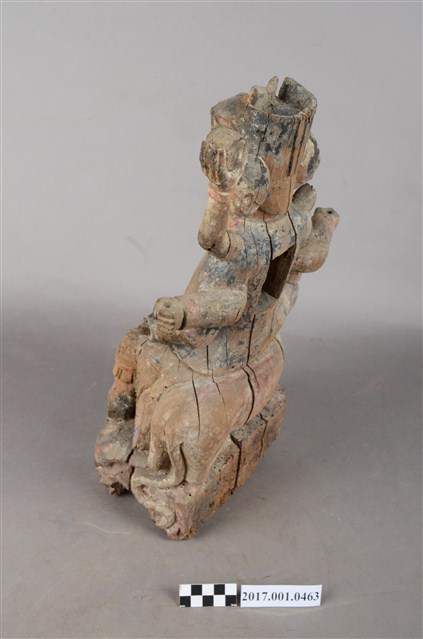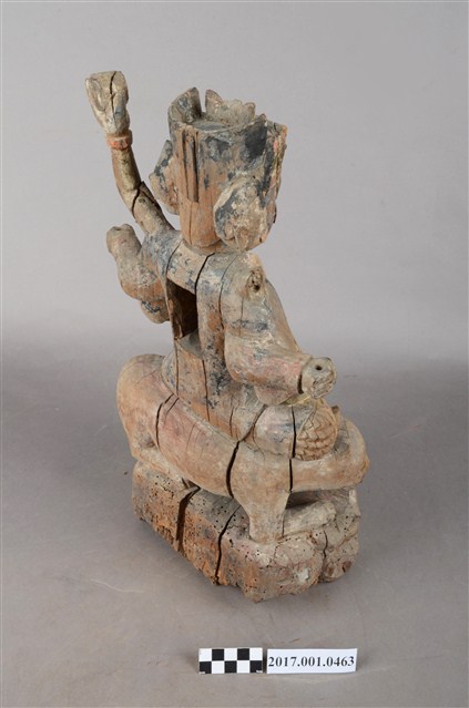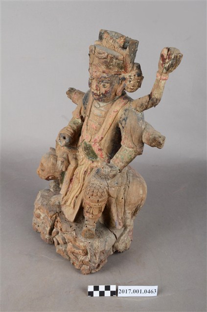 1.本件木雕殷元帥像採坐姿,坐於虎背上,表面施以錦雕彩繪技法,彩繪層部分剝落,背面開有長方形入神洞,封榫佚失。元帥雕有三臉,左右兩側頭為童子結髻,表情各異。正面臉皺眉,雙眼瞠視,鼻頭顴骨凸起。頭戴幞頭,身穿甲袍,外披對襟衫,雙腿露出兩襠,雕飾鎧甲鱗片等紋,雙足穿皂靴。背後長出四隻手臂,正後方手臂持日月,右臂斷裂。中間二臂握拳,左手握元寶置於左膝,右手持物置於右膝,持物遺失,左腳踩地,右腳翹起置於虎頭上。老虎露出虎牙,眼睛大且色黑,表情憨厚,匍匐於地上。臺座作高方臺,左側雕飾有蛇、右側雕蜥蜴,中間為蝴蝶紋飾。神像底部蟲蛀嚴重。