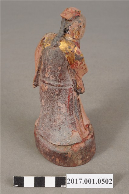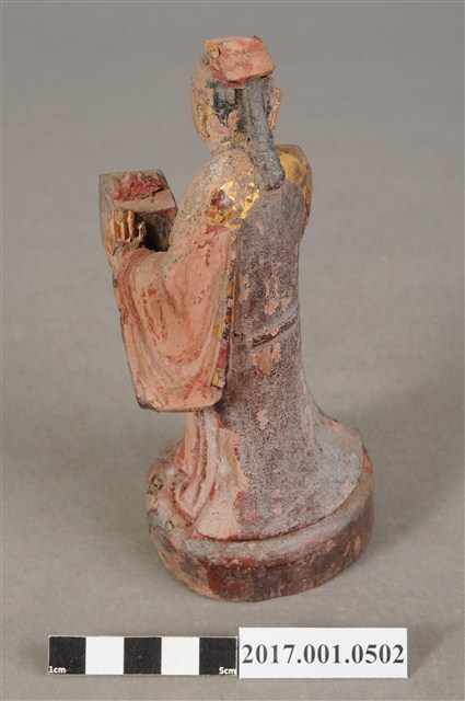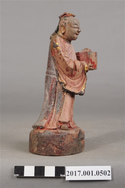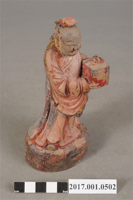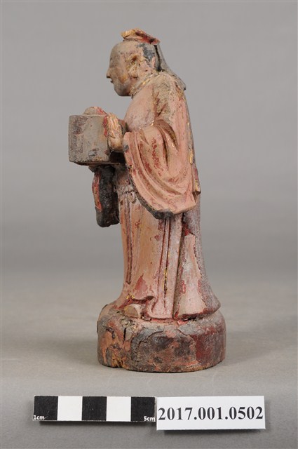 1.本件木雕印童像,作立姿姿態,表面施作塗裝粧佛技法,安金層已褪去。臉型輪廓橢圓。頭梳髮髻束巾。頭巾帶垂至肩後,身著右衽寬袖長袍,雙腳穿鞋。立像挺身以雙腳分立的姿態站於臺座上,右手左伸,托一只包巾包裹之印盒,左手掌扶印盒。臺座雕刻成圓形。