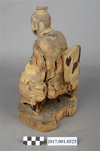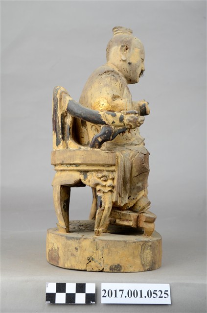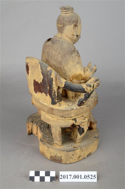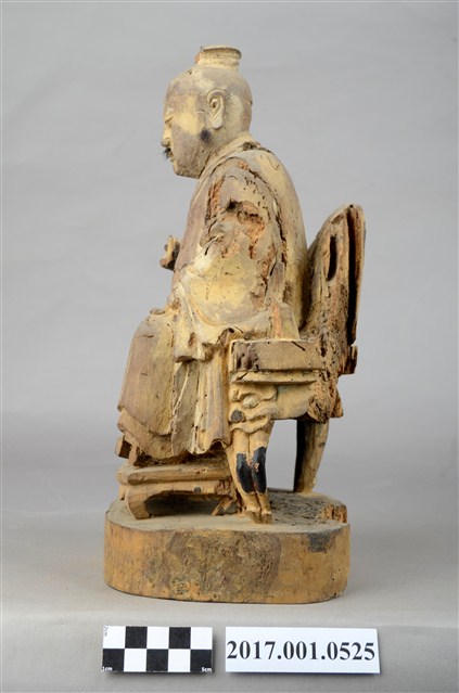 1.本件木雕孚佑帝君像,作坐姿姿態,表面粧佛已褪去。臉型輪廓橢圓,雙目半睜,鼻翼兩側、下顎、兩頰旁皆有植鬚孔,鬍鬚已斷裂脫落。頭頂梳髮髻束巾,身著右衽寬袖長衣,腰繫布帶,坐於圈背椅上。身驅前傾,雙足向下,右腿內縮,左手掌置於腿上,右手舉起作托物狀。圈背椅的椅背披坐布,扶手的出頭雕刻龍頭,左側扶手損毀,圈背椅的前足雕刻螭虎吞腳,椅前有踏几。
