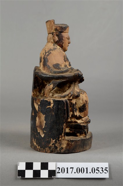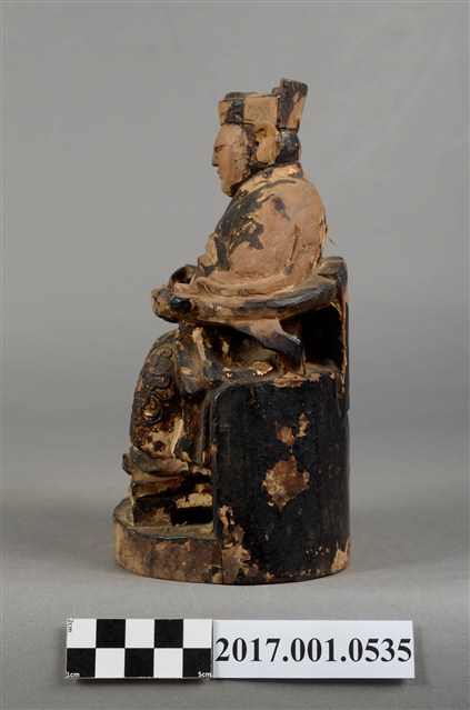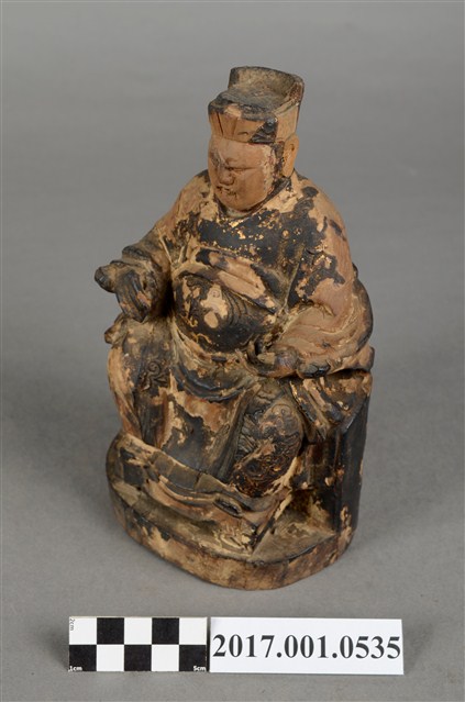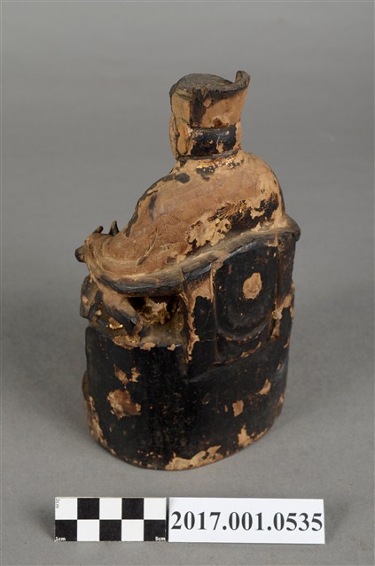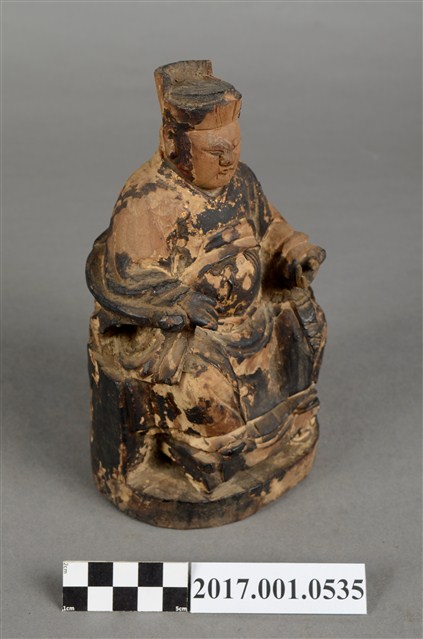 1.本件木雕灶君像,作坐姿姿態,坐於圈背椅上,表面粧佛剝落。臉型輪廓圓潤,雙眼半睜。頭戴忠靖冠,身著右衽寬袖衣,肚腹圓凸,腹下束腰帶,胸前有看帶。挺身端坐,雙足垂下,左右手倚著圈椅扶手,左手掌心朝上作托笏狀,笏板已失,右手置於座椅扶手,此坐姿手勢稱為「如意體」。圈背椅的椅背披著坐布,椅前有踏几。