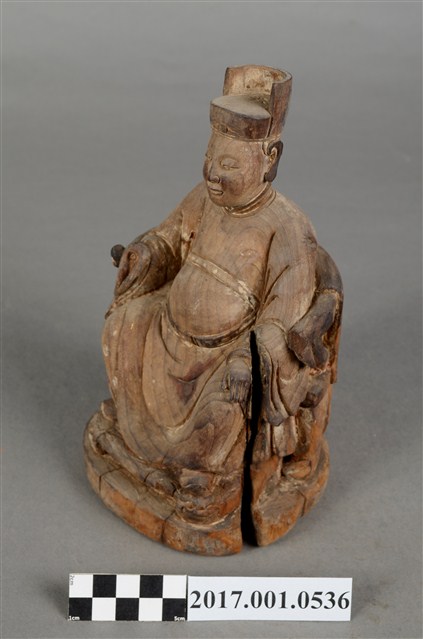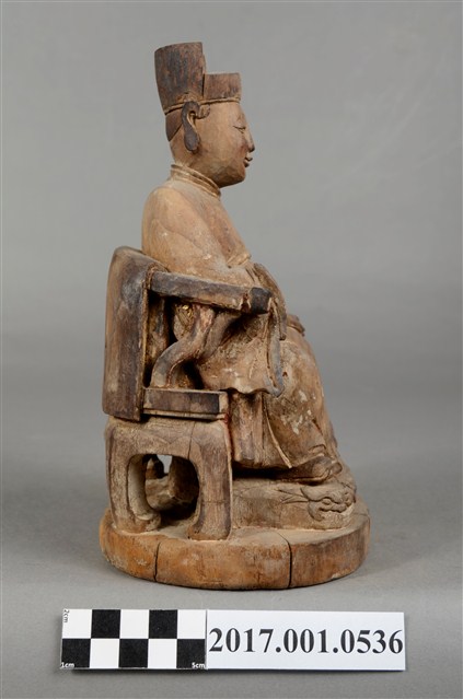 1.本件木雕灶君像,作坐姿姿態,表面粧佛已褪去,神像左側有裂痕,右手手掌斷裂缺損。臉型輪廓橢圓,雙眼半睜。頭戴忠靖冠,身著盤領衣,肚腹圓凸,腰束玉帶,胸前有看帶,坐於圈背椅上。挺身端坐,雙足垂下,左手置於腿上,右手翻小臂向前平舉,應為翻掌向上作托物狀,此坐姿手勢稱為「如意體」。圈背椅的椅背披著坐布,左側扶手的出頭已失,椅前有踏几,踏几刻螭虎吞腳。