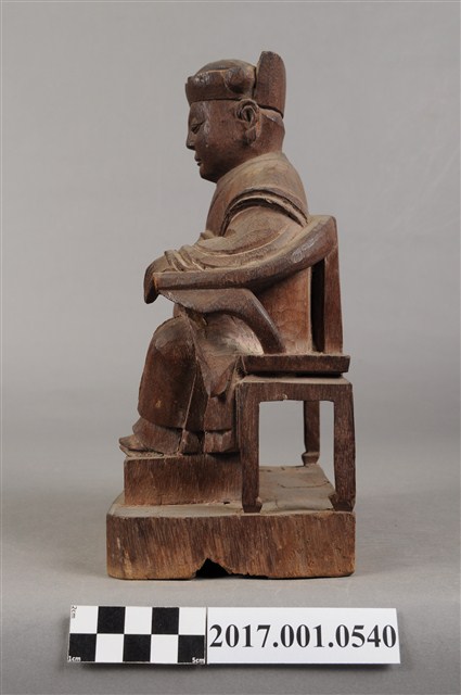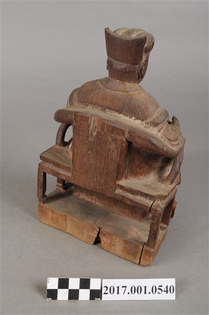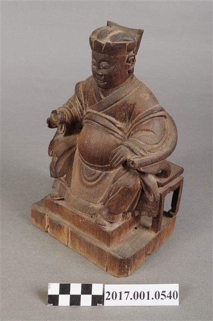 1.本件木雕灶君像,作坐姿姿態,表面未有施作粧佛。臉型輪廓橢圓,雙眼半睜。頭戴忠靖冠,身著右衽寬袖衣,肚腹圓凸,腹下束腰帶,胸前有看帶,坐於圈背椅上。挺身端坐,雙足垂下,雙手倚著圈背椅的扶手,右手翻掌向上作托物狀,此坐姿手勢稱為「如意體」。圈背椅的椅背披著坐布,圈背椅的左側扶手出頭遺失、右側扶手的出頭削除,椅前有踏几。