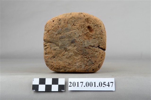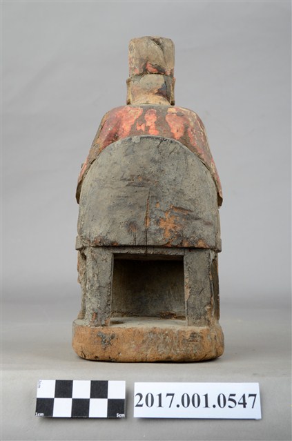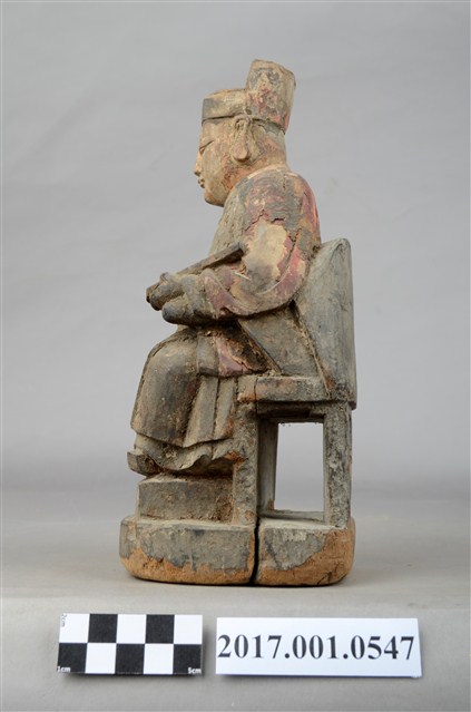 1.本件木雕灶君像,作坐姿姿態,表面粧佛已褪去。臉型輪廓圓潤,雙眼半睜。頭戴忠靖冠,身著盤領衣,肚腹圓凸,腹下束腰帶,胸前有看帶,腹下垂蔽膝,坐於圈背椅上。挺身端坐,雙足垂下,雙手倚著圈背椅的扶手,左手翻掌向上,持一只笏板,右手掌損毀,此坐姿手勢稱為「如意體」。圈背椅的椅背披著坐布,椅前有踏几,臺座作矮圓臺。