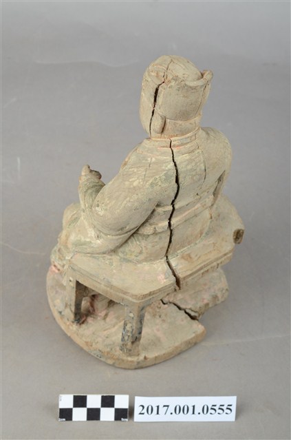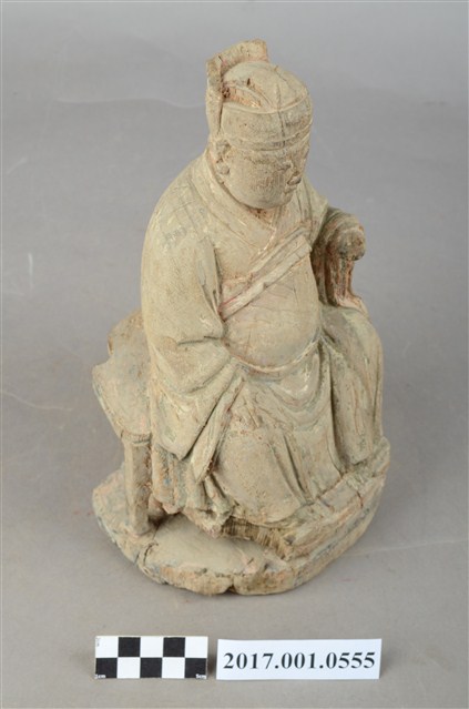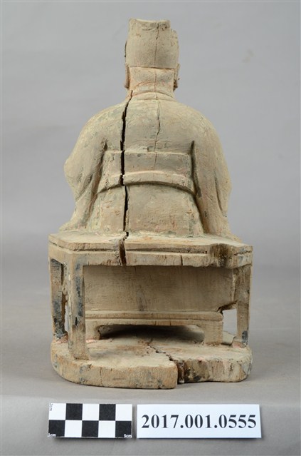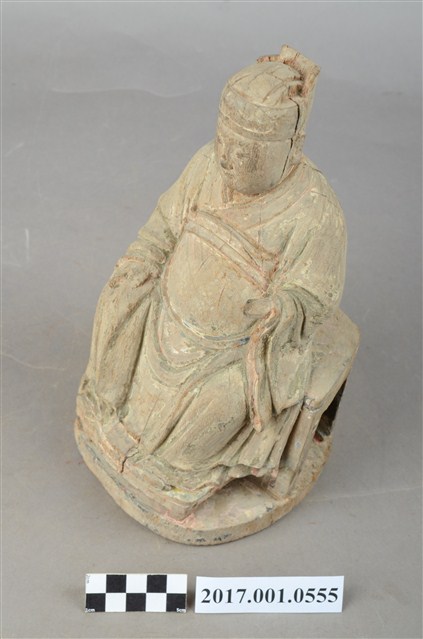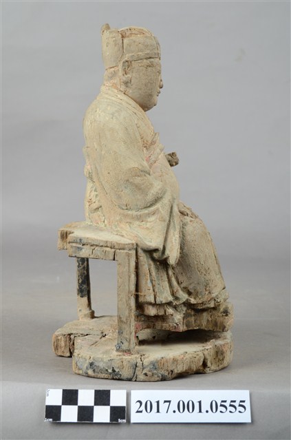 1.本件木雕灶君像,作坐姿姿態,表面粧佛已褪去,背面有裂痕。臉型輪廓橢圓,雙眼半睜。頭戴忠靖冠,身著右衽寬袖衣,肚腹圓凸,腹下束腰帶,胸前有看帶,坐於椅凳上。挺身端坐,雙足垂下,左手翻掌向上作托物狀,右手掌置於腿上,此坐姿手勢稱為「如意體」。椅凳的一腳斷裂缺損,椅凳前有踏几。臺座作圓臺。