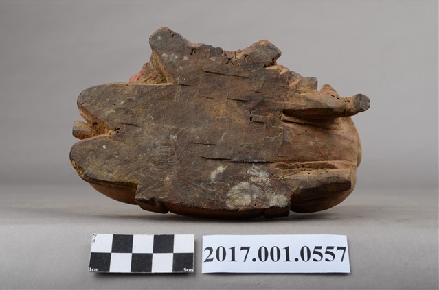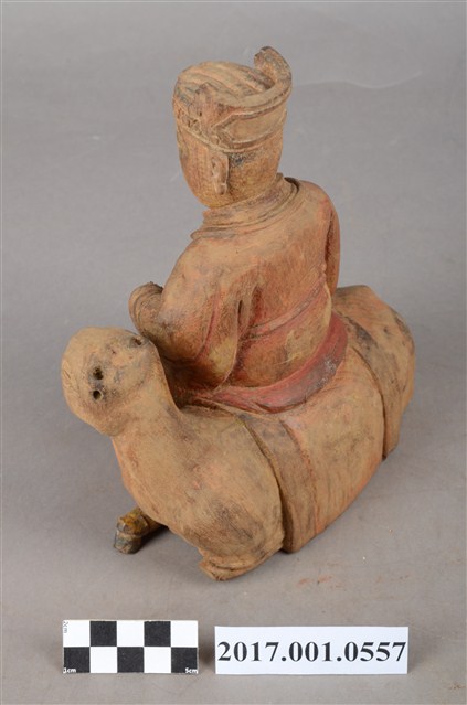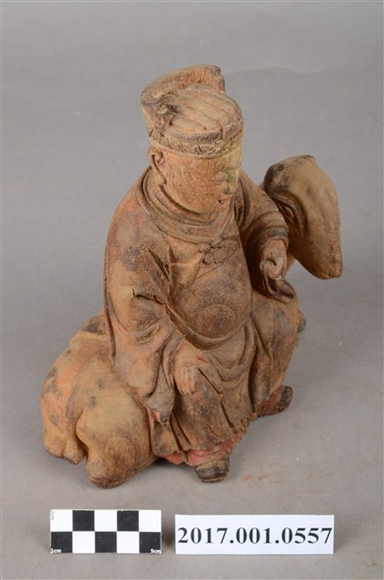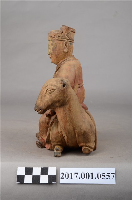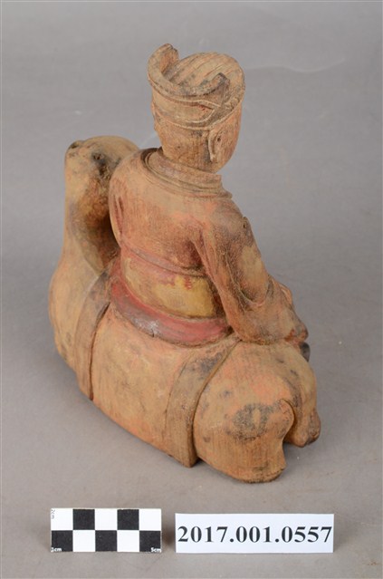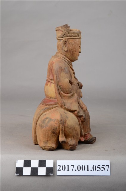 1.本件木雕灶君像採坐姿,灶君橫坐於一匹跪伏於地上之鹿,表面粧佛已除去,背部殘留紅色漆面,鹿之角缺損。灶君作年輕男子相貌,面相圓潤,頭戴忠靖冠,身穿圓領寬袖袍服,頸掛「方心曲領」掛飾,下端作如意鎖片造形,腹部下方束腰帶。右手扶於右膝上,左手小臂朝前平舉,手心朝右上方,手指虛握,手中持物已失,雙腳踏於地面上,左腿稍向內收。座下之鹿頭部位於灶君身左,作回首狀而臉部朝前四肢作跪伏狀。