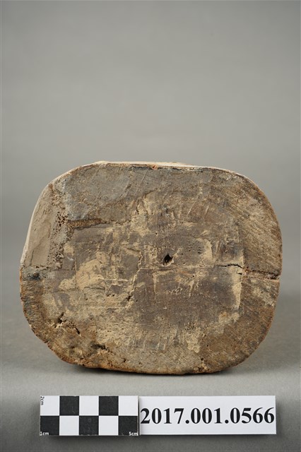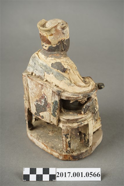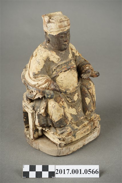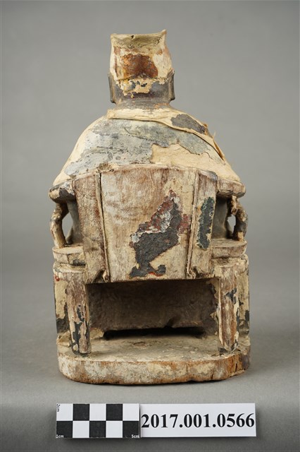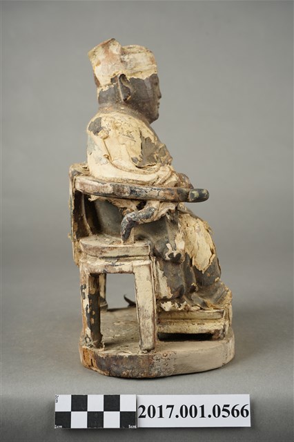 1.本件木雕灶君像,作坐姿姿態,坐於圈背椅上,表面施作塗裝、安金不見紅粧佛技法,尚存部分粉雕,粧佛剝落嚴重。臉型輪廓圓潤,雙眼半睜。頭戴忠靖冠,身著右衽寬袖衣,肚腹圓凸,腹下束腰帶,胸前有看帶。挺身端坐,雙足垂下,雙手倚著圈背椅的扶手,左手翻掌向上作托物狀,此坐姿手勢稱為「如意體」。圈背椅的椅背披著坐布,椅前有踏几。
