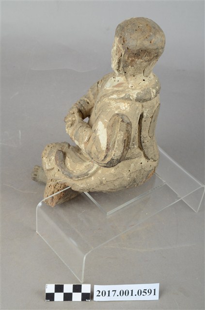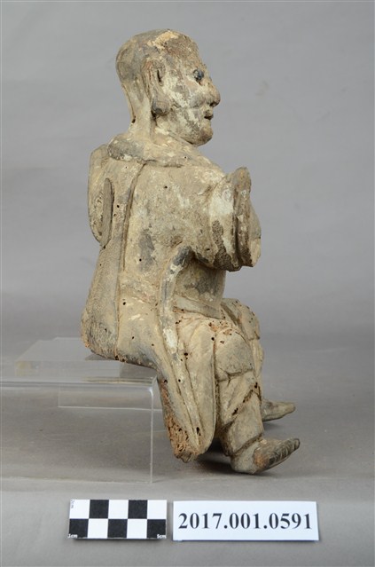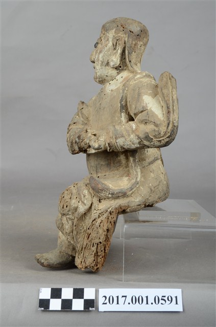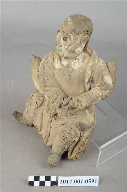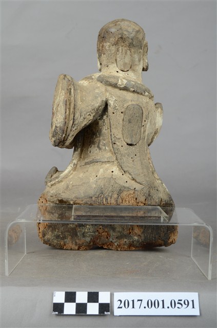 1.本件木雕法主公像,作坐姿姿態,表面粧佛已褪去,後腦、後背開有橢圓形入神洞,封榫尚存。臉型輪廓橢圓。頭部微側向右,皺眉,雙眼瞠目,嘴微開,顴骨與下顎凸出,腦後雕刻披髮。身著右衽寬袖衣,頸披法索,腰繫布帶,跣足。挺身端坐,雙足垂下,右腳向斜前方外推、左腳向內,作「文武腳」坐姿,雙手結手印置於左胸前,衣袖向後擺動上揚。本件屬於「脫椅」作法,臺座已失。