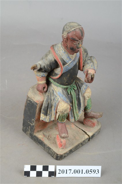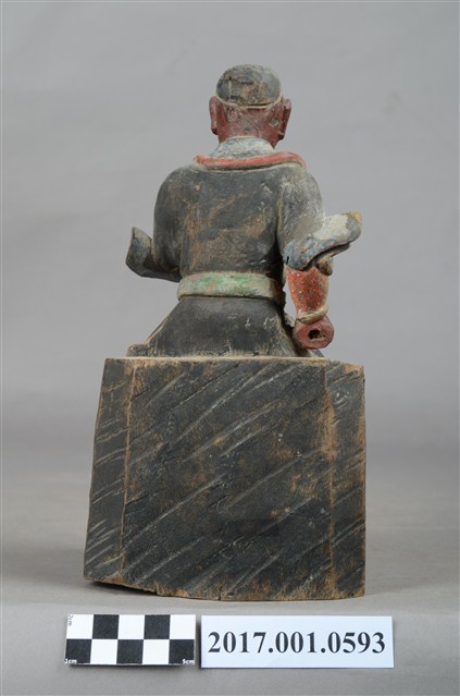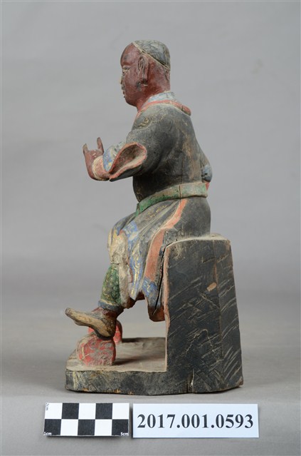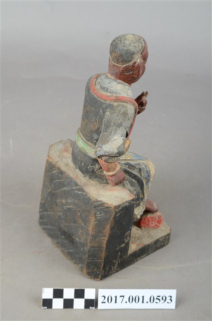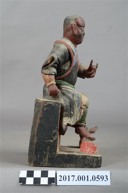 1.本件木雕法主公像,作坐姿姿態,坐於臺座上,表面施作塗裝粧佛技法。臉型輪廓橢圓,皺眉,雙眼瞠目,顱骨、顴骨與下顎凸出,鼻翼兩側、下顎、兩頰旁皆有植鬚孔,毛髮已斷裂遺失,腦後雕刻披髮。身著右衽寬袖衣,頸披法索,腰繫布帶,帶頭垂於兩膝間,小腿綁腿,跣足。挺身端坐,雙足垂下,兩腳踏輪,左手小臂前伸,手指朝上,只拇指按中指和無名指,作道指訣,右手握拳持物向下,持物已失,衣袖袖口向後上揚。